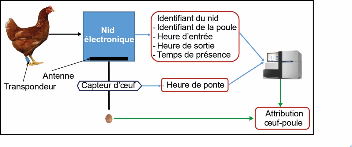 À l'aide de nids électroniques, Icken et al. (2008a) ont enregistré le comportement au nid de 272 poules RI élevées dans un parc au sol avec un accès à un jardin d'hiver. Le nombre d'œufs pondus dans le nid mesuré sur 12 périodes de 28 jours s'est révélé héritable, mais les héritabilités estimées étaient variables selon l'âge des poules (entre 0,05 à 9 mois et 0,45 à 14 mois). La corrélation génétique (encadré 1) estimée entre le nombre d'œufs pondus en cage et le nombre d'œufs pondus dans le nid est aussi très variable en fonction de l'âge des poules, passant de valeurs positives fortes, entre 0,56 et 0,97 durant les deux premiers mois de ponte, à des estimations plus faibles, entre 0,22 et 0,44 au pic de ponte (Icken et al., 2012). Ces paramètres génétiques, estimés sur un faible effectif, demandent à être précisés mais cette étude originale révèle peut-être l'existence d'interactions génotype-environnement pour la production d'œufs. Les valeurs de corrélations génétiques différentes de 1 entre production en cage et production au nid peuvent également être dues à la signification de ces deux phénotypes : avec le nid électronique, le comportement de la poule, c'est-à-dire sa capacité à aller pondre dans le nid, se combine avec sa capacité de ponte exprimée en cage. Afin d'améliorer la production d'œufs dans les systèmes alternatifs, des études complémentaires sont nécessaires pour améliorer les connaissances sur les caractères de comportement de ponte au nid des poules.