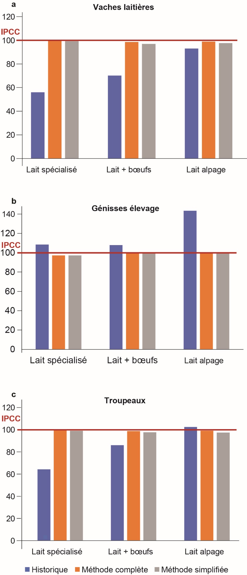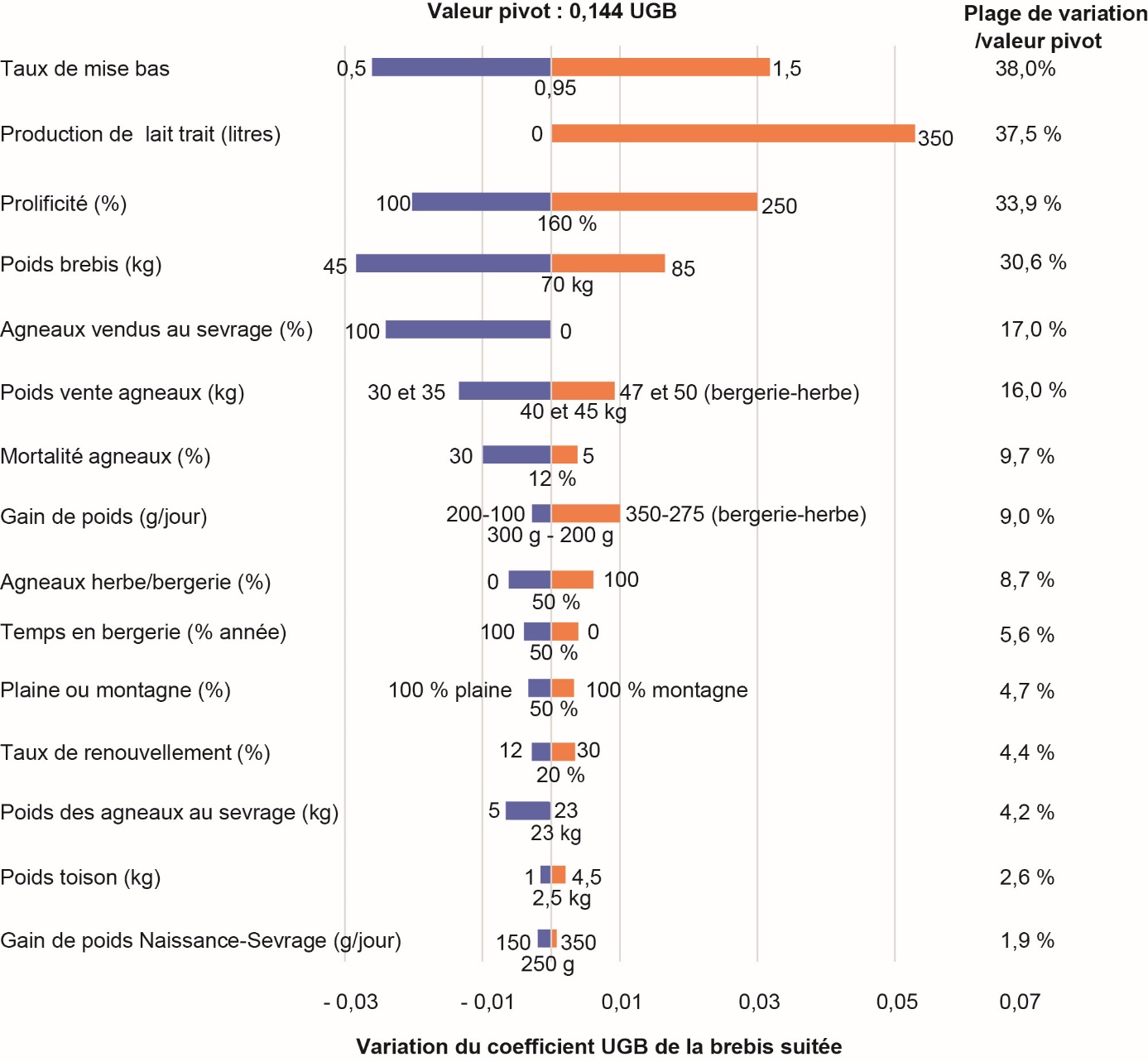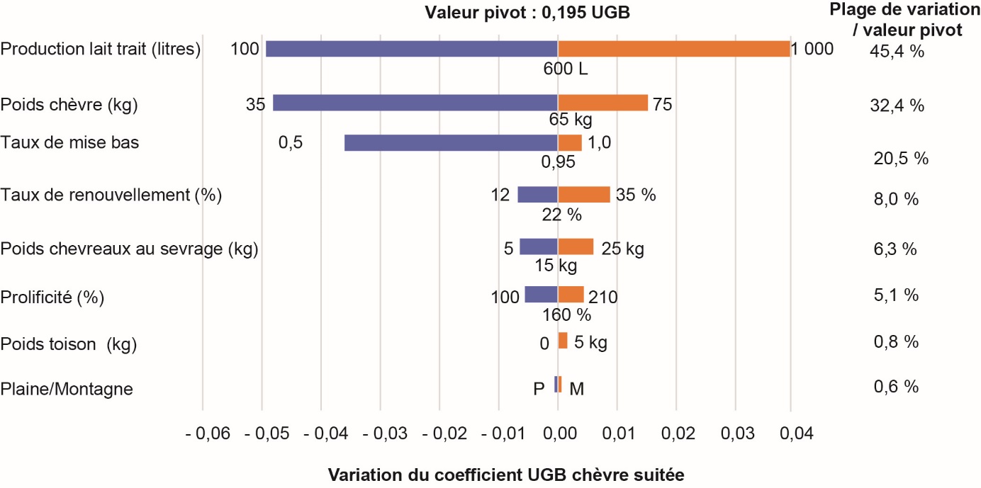 Par ailleurs, pour les brebis laitières, les valeurs moyennes issues de Mc et Ms restent du même ordre qu’avec MH. Par exemple, pour une brebis de 70 kg produisant 280 kg de lait par an, ses agneaux étant sevrés à 10 kg, le coefficient UGB (Mc) est de 0,17, soit comparable à celui calculé par l’Institut de l’Élevage (France) pour des brebis du même type (Idele, 2014a). De même en production caprine, les ordres de grandeur correspondent aux standards habituels, pour des systèmes de production relativement productifs (963 litres de lait par chèvre en France en 2019, Idele, 2020b).