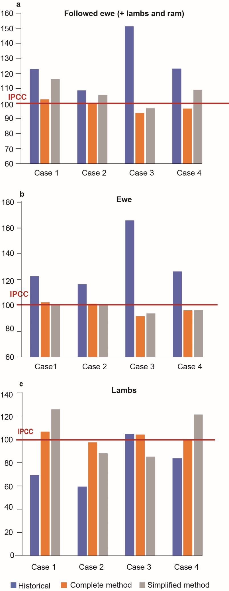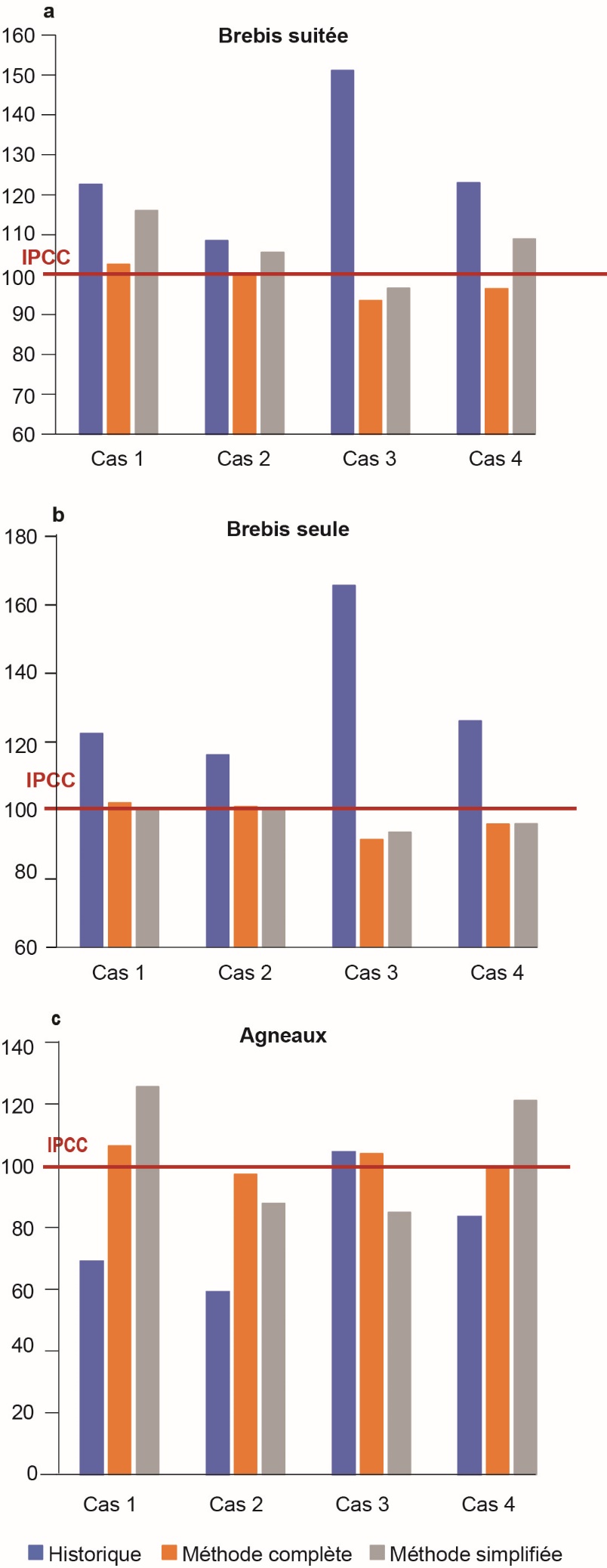 Figure 5. Écart pour 4 types d’élevage ovin décrits au tableau 12 des valeurs UGB de la brebis suitée (a), brebis seule (b), agneaux (c), calculées selon les méthodes historique, complète et simplifiée, par rapport à une base 100 correspondant au calcul des UGB selon les équations du GIEC.