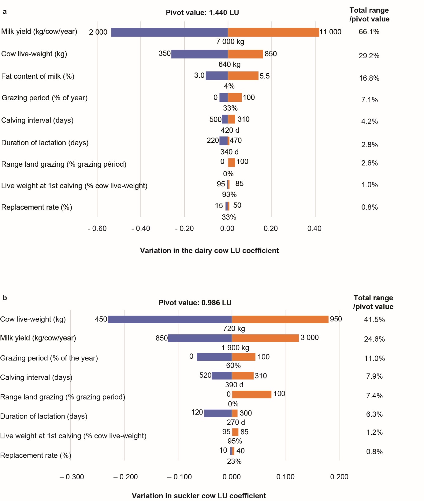 Après avoir présenté nos propositions et nos choix méthodologiques visant à être génériques c’est à dire appliqués dans des contextes de production variés et contrastés, nous faisons une proposition de calcul d’UGB pour les bovins, ovins et caprins à l’échelle d’un troupeau. Une analyse de sensibilité pour chaque paramètre retenu et pris indépendamment dans cette méthode de calcul nous conduit à proposer deux types d’équations selon les informations disponibles, et dont le niveau de précision sera différent. Enfin, nous discuterons la méthode retenue ainsi que les résultats d’application des deux méthodes sur des cas-types contrastés en production bovins laitiers et ovins viande.