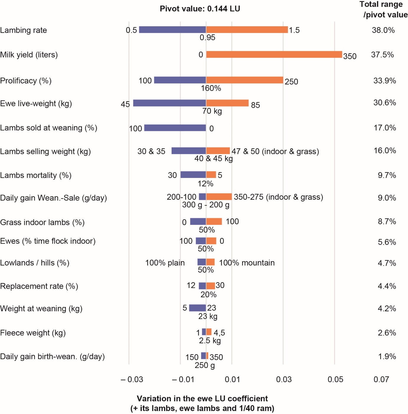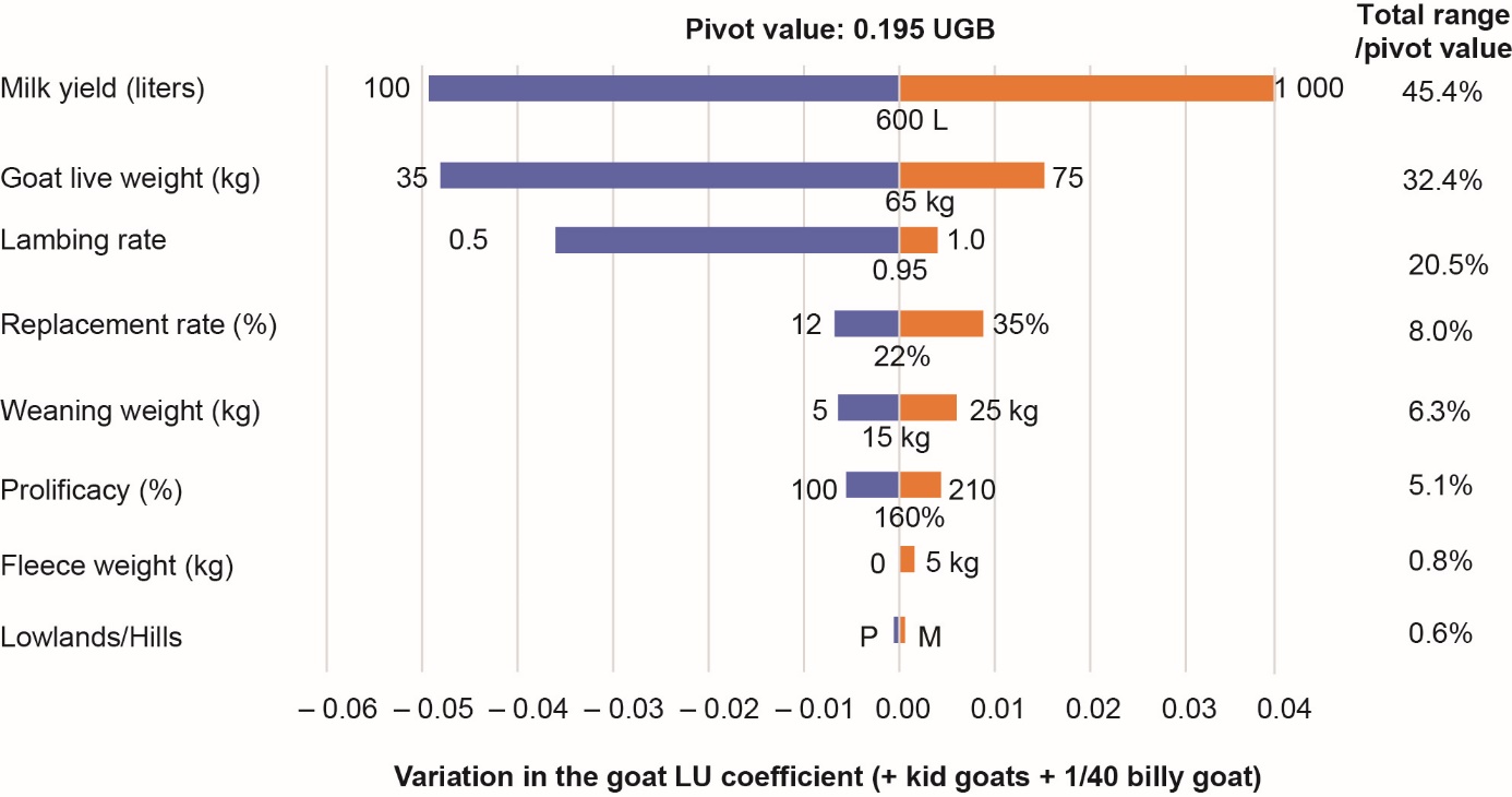 Par ailleurs, pour les brebis laitières, les valeurs moyennes issues de Mc et Ms restent du même ordre qu’avec MH. Par exemple, pour une brebis de 70 kg produisant 280 kg de lait par an, ses agneaux étant sevrés à 10 kg, le coefficient UGB (Mc) est de 0,17, soit comparable à celui calculé par l’Institut de l’Élevage (France) pour des brebis du même type (Idele, 2014a). De même en production caprine, les ordres de grandeur correspondent aux standards habituels, pour des systèmes de production relativement productifs (963 litres de lait par chèvre en France en 2019, Idele, 2020b).
