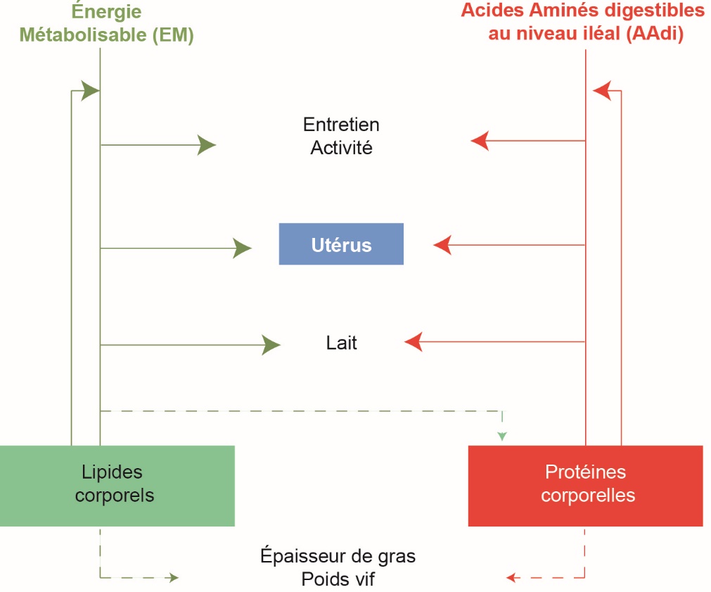 Chez les mammifères, le processus de reproduction, depuis la conception jusqu'au sevrage peut être considéré comme visant à protéger la progéniture des stress physiologiques ou nutritionnels (Oldham, 1991), en mettant en œuvres des mécanismes d'homéostasie et d'homéorhèse de contrôle de l'utilisation des nutriments (Bauman et Currie, 1980), dans lesquels les réserves corporelles jouent un rôle important. Les troubles de la reproduction qui conduisent à la baisse de la productivité des truies ou à leur réforme prématurée ont souvent été associés à des variations prononcées des réserves corporelles (Whittemore et al., 1980 ; King, 1987 ; Dourmad et al., 1994 ; Whittemore, 1996).