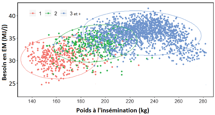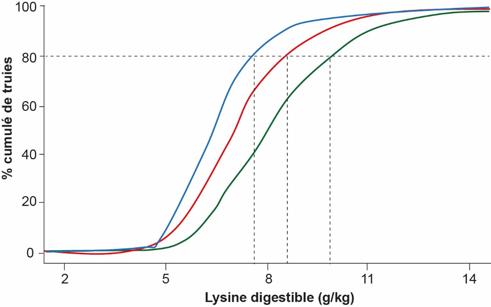 Un autre élément important à considérer dans la définition des besoins nutritionnels est la forte variabilité des performances entre élevages. Par exemple en 2016 les 10 et 1 % des élevages les plus performants sèvrent respectivement 8 et 16 % de porcelets en plus par portée que la moyenne des élevages. De plus, en raison de la forte variabilité de plusieurs paramètres biologiques (prolificité, production laitière, appétit des truies), la variabilité des performances entre animaux est également très élevée intra élevage, même si elle est en partie compensée par des pratiques d'élevage comme l'adoption de porcelets (Quiniou et al., 2012). La taille de la portée influence fortement la production laitière, même si elle n'explique qu'environ 50 % de la variabilité entre truies. Ngo et al. (2012) ont ainsi montré que la production laitière moyenne s'accroît d'environ 0,75 kg/j par porcelet supplémentaire, alors que la quantité de lait disponible par porcelet diminue, en particulier au-delà de huit porcelets par portée, et de façon plus marquée au-delà de 12.