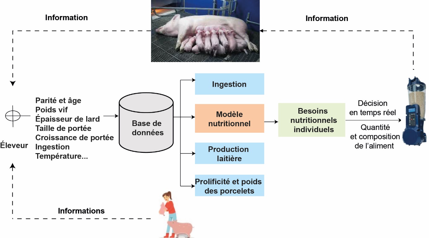 Ces dernières années, avec le développement de l'utilisation de truies hyperprolifiques, les performances de reproduction ont considérablement augmenté dans les élevages. Cette amélioration des performances a été l’un des principaux moteurs de l'évolution des besoins nutritionnels des truies gestantes et allaitantes. Dans le même temps, de nombreuses connaissances scientifiques ont été produites permettant, à l'aide de la modélisation mathématique, une approche holistique du raisonnement des apports en énergie, en Acides Aminés (AA) et en minéraux. L'objectif de cette synthèse est à la fois de décrire ces évolutions et de montrer comment l'état actuel des connaissances sur la nutrition des truies peut être utilisé pour développer des modèles et des outils d'aide à la décision, et ainsi améliorer les stratégies d'alimentation dans les élevages. Différents exemples sont présentés pour illustrer comment l'utilisation de tels outils peut aider à optimiser la productivité des truies, en particulier dans le cadre du développement de l’alimentation de précision. Jusqu'à récemment, la maximisation des performances de reproduction des truies et de leurs portées a constitué le principal objectif dans la définition des apports nutritionnels. Cette situation évolue rapidement vers de nouveaux objectifs liés aux préoccupations croissantes de la société pour le bien-être animal et l'environnement qui deviennent maintenant prioritaires. Cela jouera un rôle majeur dans l'évolution future des systèmes d’élevage porcins, et de la conduite et de l’alimentation des truies, faisant appel à de nouvelles connaissances scientifiques et au développement de nouvelles technologies, en particulier celles du numérique.