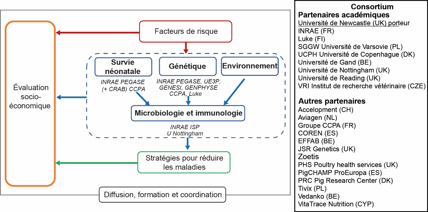 En Europe, la grande majorité des porcs et des poulets de chair sont élevés dans des élevages intensifs, en bâtiments fermés avec une forte densité d’animaux. Contrairement aux idées reçues, les maladies de production, telles que définies dans le chapeau, ne sont pas spécifiques de ce type d’élevage soumis à forte contrainte de productivité, mais dans ces derniers, certaines pratiques peuvent constituer des facteurs aggravants de ces maladies et de leurs conséquences. Pour répondre aux préoccupations citoyennes et sociétales et aux enjeux de santé publique, l’amélioration de la santé des animaux d’élevage doit concilier une meilleure prise en compte de leur bien-être et une réduction de l'utilisation des antibiotiques. L’ambition du projet PROHEALTH était d’apporter des connaissances et de proposer des solutions pour prévenir et réduire les effets des maladies de production des porcs et des volailles. Ce projet interdisciplinaire d’ampleur (figure 1) a rassemblé 22 partenaires, chercheurs en science vétérinaire, épidémiologie, physiologie, génétique, nutrition, sciences humaines et sociales et des acteurs des filières. Cet article synthétise les principaux résultats obtenus par INRAE pour l’espèce porcine.