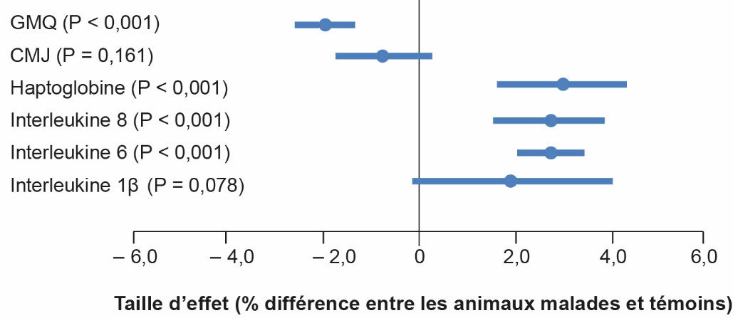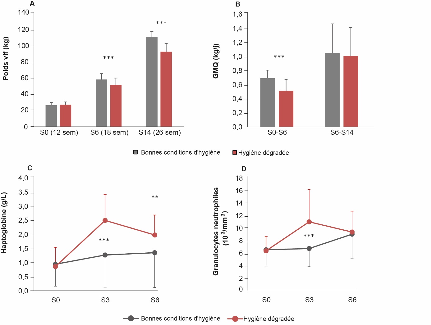 Figure 8. Influence des conditions d’hygiène du logement sur la croissance et des indicateurs sanguins d’inflammation chez le porc en croissance.