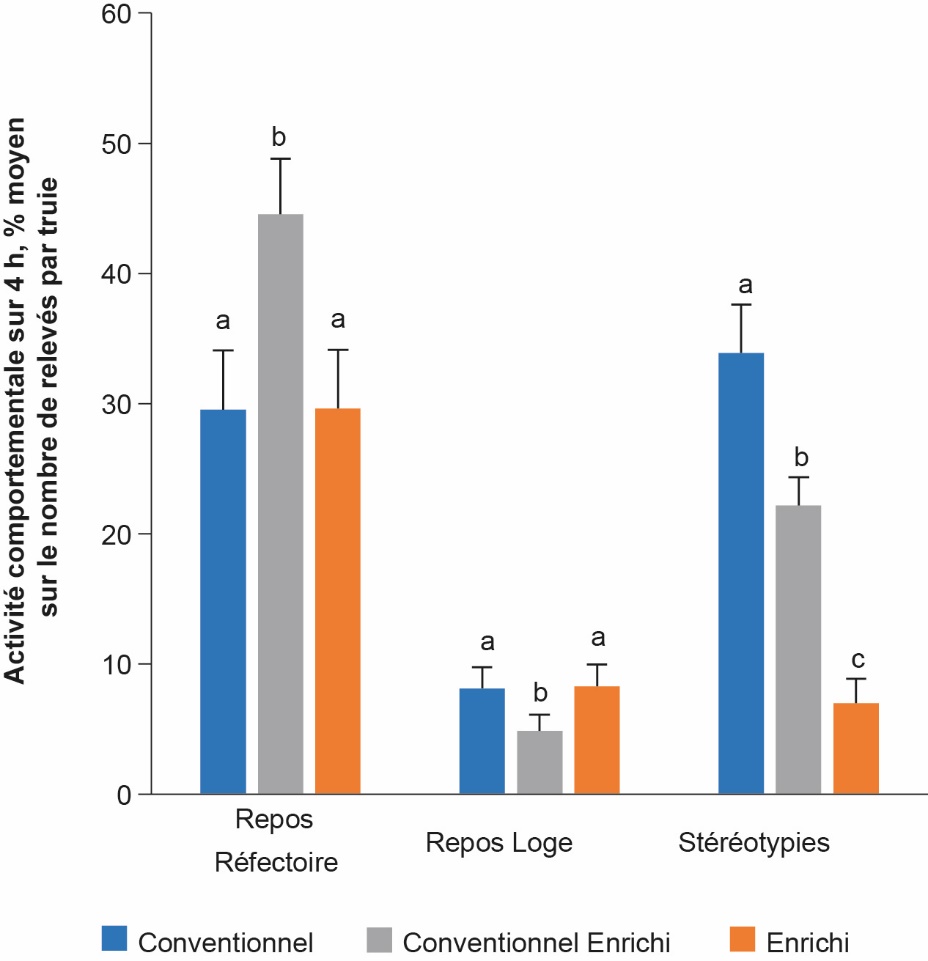Figure 4. Activité comportementale des truies à 101 jours de gestation en fonction de l’enrichissement du milieu d’élevage pendant la gestation.