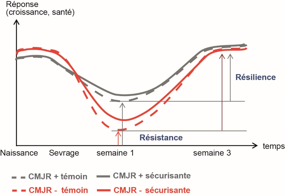 Dans un premier essai, nous avons étudié les réponses au sevrage de porcs issus des deux lignées divergentes sur la CMJR (Montagne et al., 2021), issues du dispositif de sélection présenté dans l'introduction. Notre hypothèse était que la sélection sur l'efficacité alimentaire a pu affecter la capacité d'adaptation des animaux au sevrage. Les animaux des deux lignées (n = 32 par lignée) ont été sevrés à 28 jours d'âge, logés dans des cases individuelles et ont reçu successivement deux aliments commerciaux : un aliment de démarrage (du sevrage à 11 jours après le sevrage) puis un aliment de post-sevrage (de 12 jours à trois semaines après le sevrage). Les consommations moyennes journalières d'aliment (ATOL_0005508) ainsi que les vitesses de croissance mesurées par le Gain Moyen Quotidien ou GMQ (ATOL_0000989) des porcs de la lignée CMJR-, la plus efficace, étaient respectivement 35 et 40 % plus faibles que celles des animaux de la lignée CMJR+, moins efficace, lors de la première semaine suivant le sevrage. Cette différence est à mettre en relation avec une digestibilité totale apparente de la matière organique (ATOL_0001234) inférieure de 6 %. Par ailleurs, un déficit nutritionnel plus marqué est observé chez les animaux de la lignée CMJR- pendant cette période. Chez ces derniers, les concentrations plasmatiques en acides gras libres et urée, respectivement marqueurs de mobilisation des réserves lipidiques et protéiques en réponse à une sous-nutrition, étaient 167 et 55 % plus élevées par rapport aux animaux de la lignée CMJR+. Lors de la première semaine suivant le sevrage, la prévalence des diarrhées était plus importante pour la lignée CMJR- (12 porcelets pour les CMJR- vs un pour les CMJR+), ces animaux présentant aussi une concentration en haptoglobine plasmatique supérieure (+ 52 %) comparativement aux CMJR+. Chez ces mêmes porcelets CMJR-, l'abondance de certaines espèces des genres Fusobacterium ou Escherichia dans les fèces, caractéristiques du microbiote des porcelets allaités, a diminué plus lentement après le sevrage comparativement aux porcelets CMJR+. L'évolution plus lente des populations microbiennes fécales après le sevrage peut expliquer la différence de prévalence des diarrhées (Kubasova et al., 2018). Certaines souches pathogènes d'Escherichia coli (AHOL_0004068) présentes dans l'intestin auraient ainsi bénéficié de plus de temps pour se développer et favoriser l'apparition de diarrhées infectieuses (Fairbrother et al., 2005). Au cours des deuxième et troisième semaines après le sevrage, les animaux des deux lignées avaient les mêmes performances zootechniques et des caractéristiques physiologiques similaires. Cette absence de différence se maintenait jusqu'à la fin de la période de post-sevrage. Cette étude a mis ainsi en évidence des différences dans la dynamique de réponse au sevrage selon la lignée génétique. Dans nos conditions expérimentales, les animaux de la lignée avec une efficacité alimentaire élevée (CMJR-) se sont avérés être moins résistants au stress lors de la semaine qui suit le sevrage mais être aussi résilients car capables de récupérer rapidement après le sevrage, rattrapant les porcelets de la lignée CMJR+.