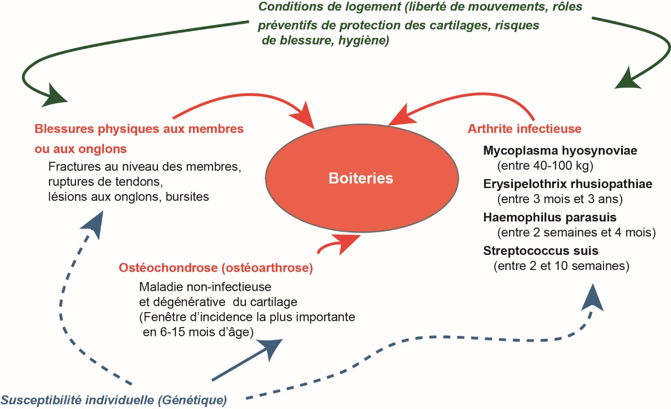 Figure 6. Facteurs de risque des boiteries chez le porc : multiples et dépendants de l'âge de l’animal (d’après Jensen et Toft, 2009).