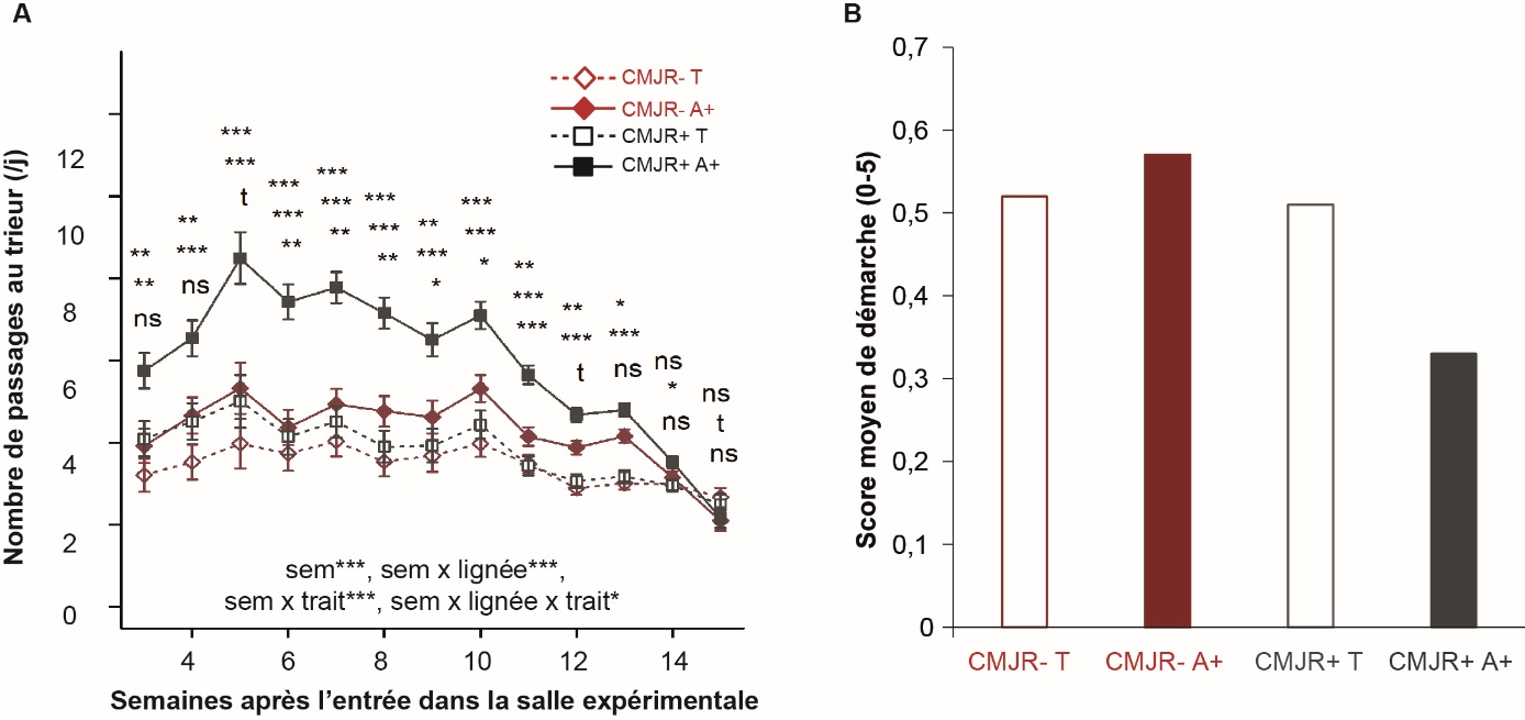 Figure 7. Dynamique d’adaptation des lignées CMJR+ et CMJR- à une augmentation induite de leur activité physique (A) et score de démarche moyen sur l’essai (B).