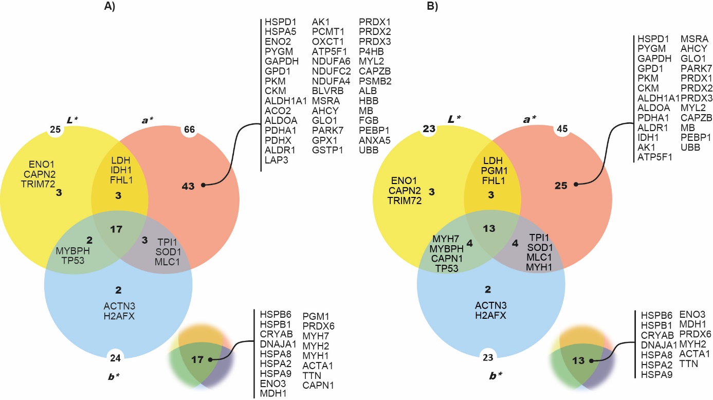 Figure 4. Diagrammes de Venn illustrant A) les 73 protéines de la liste des 79 identifiées indépendamment des races/type animaux et muscles ; et B) 54 protéines sur les 59 biomarqueurs du muscle LT, identifiées comme étant corrélées avec les paramètres L*, a*, b* de la couleur de la viande bovine.
