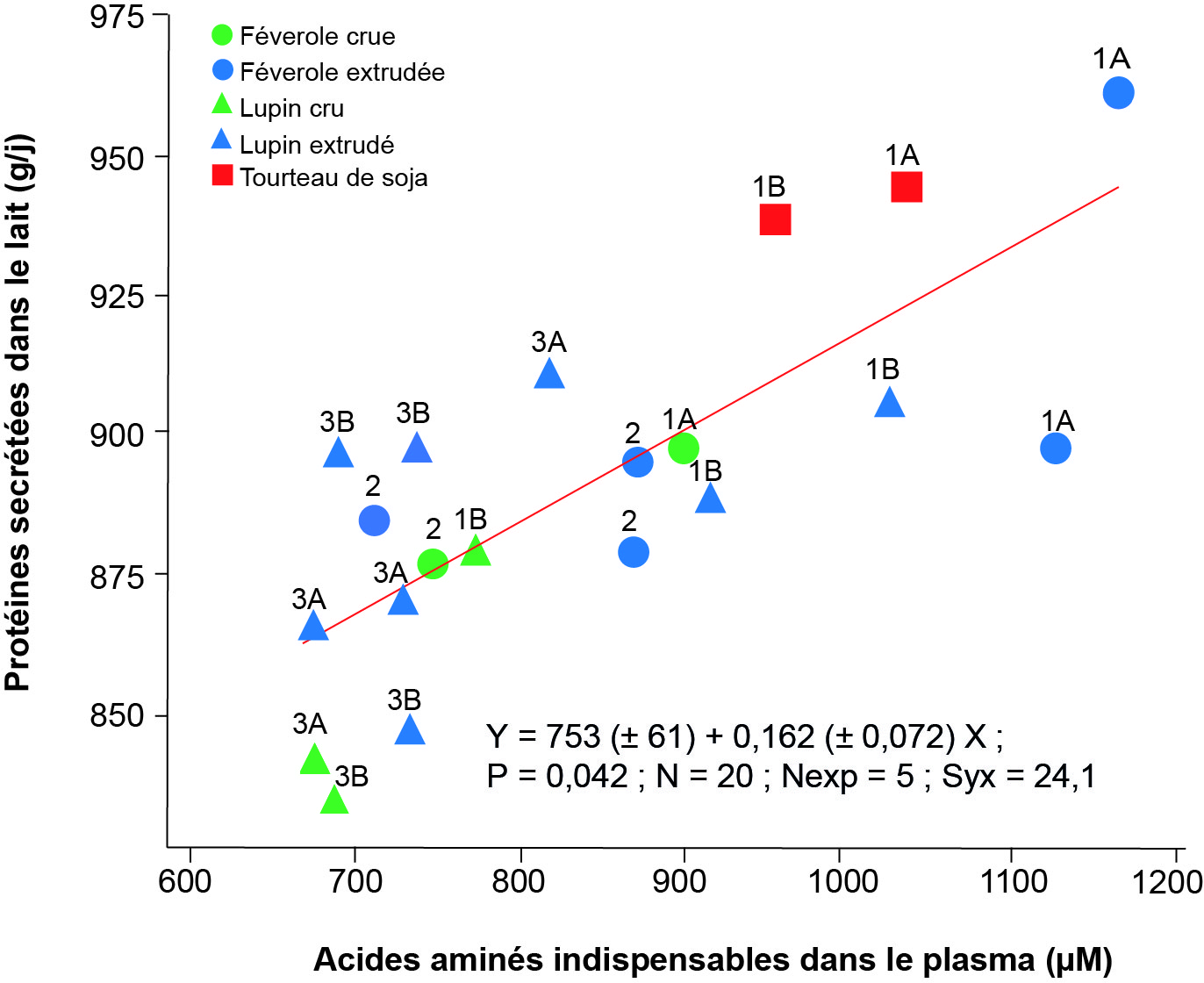 Les réponses de production aux variations de la dégradabilité des protéines des aliments concentrés, sont difficiles à mettre en évidence sur le plan expérimental. En effet, pour avoir du sens en pratique, d'une part, les comparaisons sont iso-protéiques et ne concernent qu'une partie des protéines de la ration (de l'ordre de 40 % en moyenne), ce qui rend difficile l'induction de fortes variations des teneurs en PDI entre traitements. D'autre part, les comparaisons sont généralement réalisées sur des animaux nourris autour de leur potentiel, situation dans laquelle le rendement marginal des PDI disponibles, pour la synthèse des protéines du lait, est relativement faible (en moyenne 19 %, Daniel et al., 2016). Enfin, les essais analytiques visant à déterminer la partition de l'azote ingéré entre les fèces, les urines et le lait, sont entachés de défauts de bilan non négligeables (Spanghero et Kowalski, 1997 ; Spanghero et Kowalski, 2021), bien que quantifiables (33 ± 24 g N/j, soit 5,9 ± 4,0 % de N ingéré, sur les 39 traitements de la base de données ; 50 ± 36 g N/j, soit 8,5 ± 5,4 % de N ingéré sur les 96 mesures individuelles du projet Proleval). Ce défaut de bilan peut excéder l'amplitude des variations attendues entre traitements. D'une manière générale, les réponses de sécrétion de protéines dans le lait ont été significativement et positivement corrélées à la proportion de MAT de la ration apportée par les graines traitées (Mendowski et al., 2021) et à la teneur en AA indispensables plasmatiques (figure 7), ce qui en fait un indicateur intéressant pour consolider les résultats zootechniques.