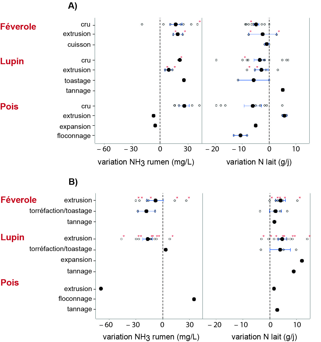 L'utilisation digestive des protéines des graines peut être appréciée par la mesure in situ de la dégradabilité dans le rumen et la digestibilité réelle dans l'intestin des aliments ou par la mesure in vivo de leur digestion à travers la teneur en ammoniaque dans le rumen et le flux de protéines alimentaires à la sortie du rumen. Les données disponibles dans la littérature pour la féverole, le lupin et le pois, crus ou traités, ont été regroupées dans deux bases de données (in situ et in vivo, 36 et 32 publications respectivement) décrites par Mendowski et al. (2021), et ont été complétées par les derniers résultats du projet Proleval. Les données in vivo ont été obtenues chez des vaches en pleine lactation (94 ± 44 jours) produisant en moyenne 31,5 ± 4,7 kg de lait/jour (min = 21,6 ; max = 41,0) avec des rations à base de fourrages conservés (maïs ou herbe) comprenant 44 ± 14 % de concentré. Les traitements étudiés étaient des procédés thermiques (cuisson sèche, cuisson à la vapeur, toastage/torréfaction), thermomécaniques (floconnage, expansion, extrusion, autoclavage), ou biochimiques (tannage). Les publications étant généralement ciblées sur une seule graine, les données disponibles ne permettaient pas d'étudier les interactions entre les effets de la « graine » et du « traitement ». Les données ont donc été analysées quantitativement pour chaque publication en comparant le traitement expérimental et le traitement témoin : graine crue vs tourteau de soja, et pour chacun des traitements technologiques, graine traitée vs tourteau de soja, et pour chaque graine (traitée vs crue). Le détail des résultats a été décrit par Mendowski et al. (2021). Seules les principales conclusions sont rapportées et discutées ici.