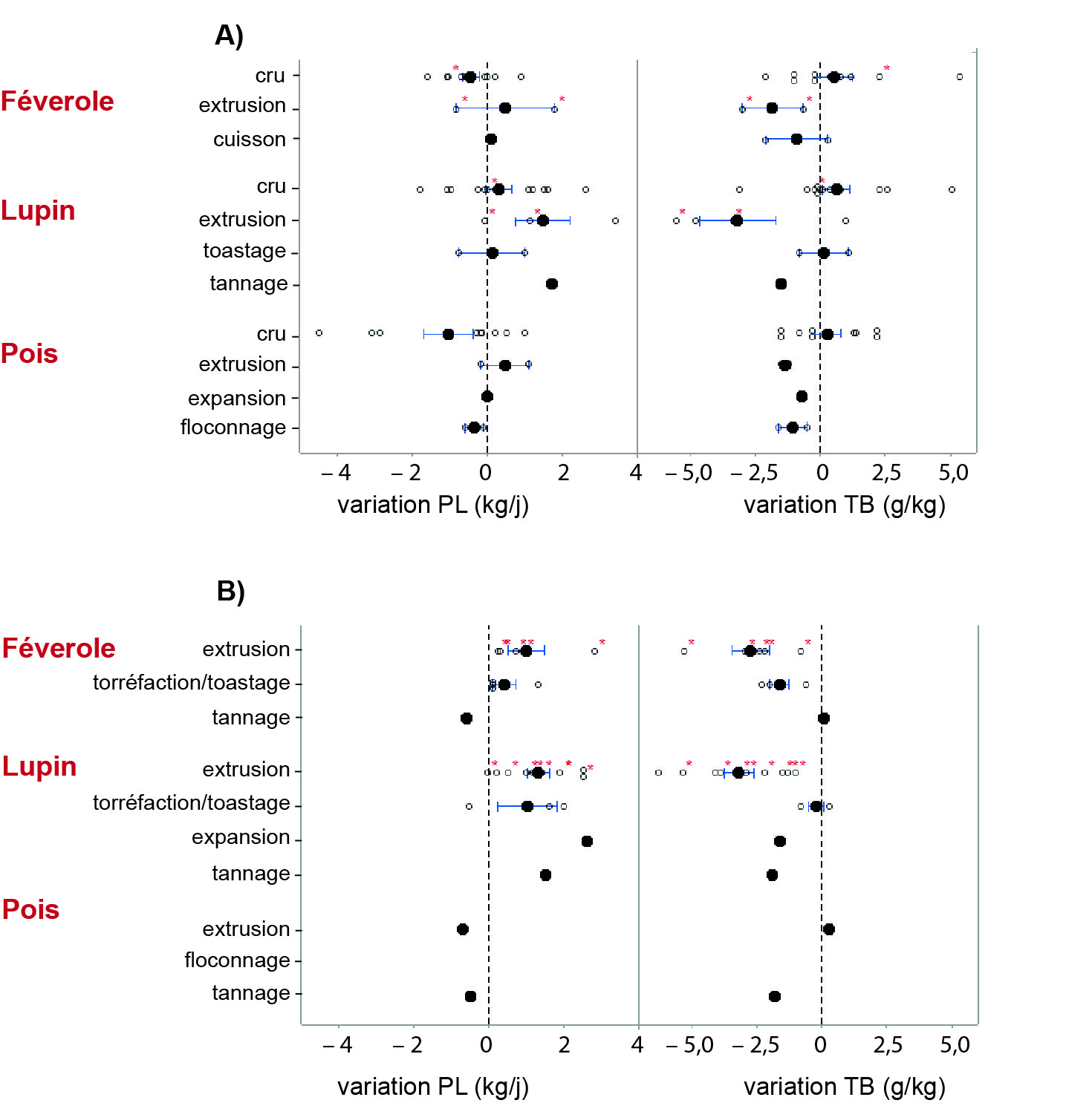 Figure 3. Variations de la Production de Lait (PL) et du Taux Butyreux (TB) chez la vache laitière alimentée avec des graines protéagineuses (Comparaisons iso-MAT : A : graine comparée au tourteau de soja ; B : graine traitée comparée à la graine crue), (Synthèse des données publiées, d'après Mendowski et al., 2021).