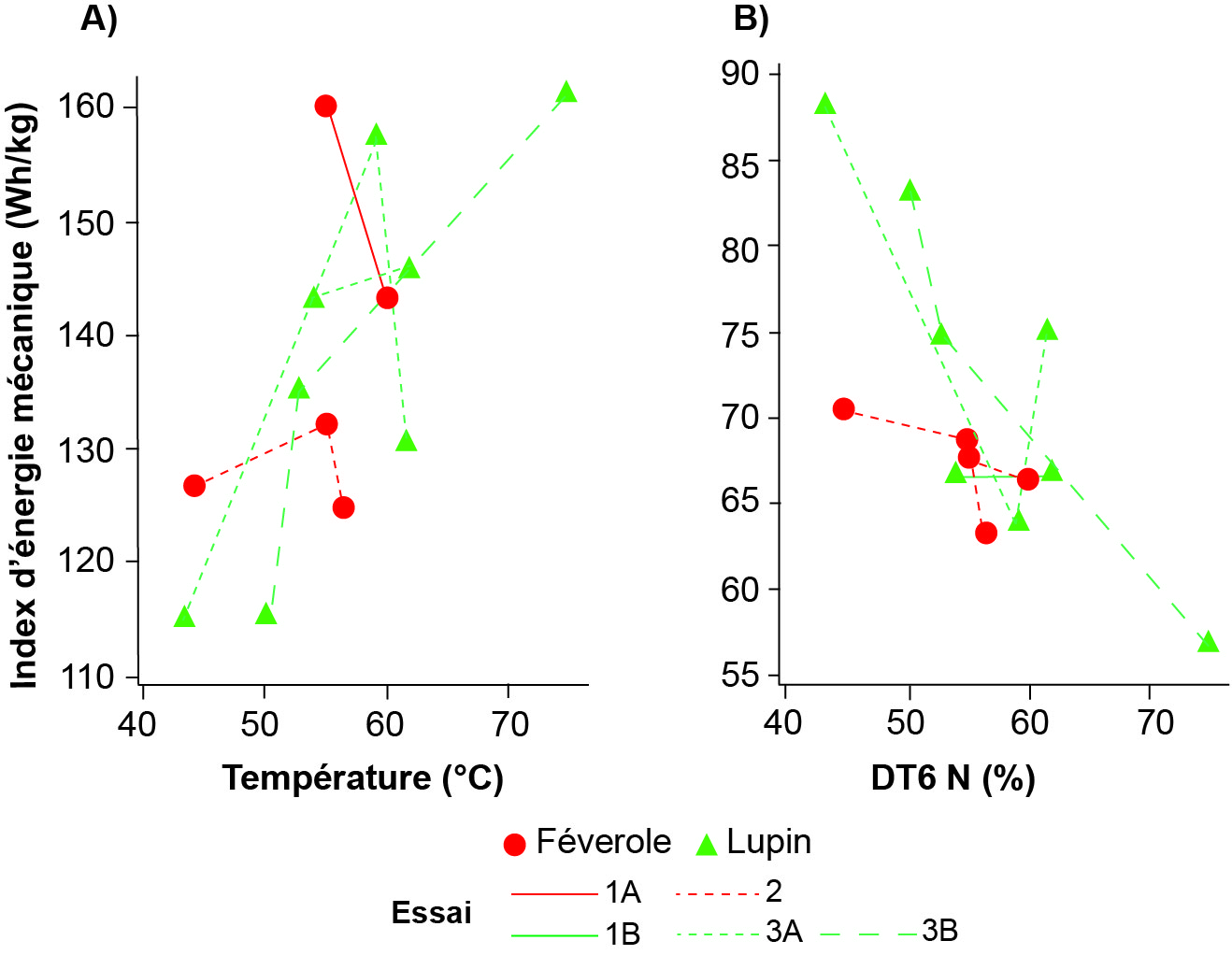 Afin de bien comprendre les différents résultats obtenus lors des essais, il convient d’abord de décrire les paramètres d’entrée et de sortie des procédés technologiques appliqués aux différentes combinaisons « graines ⨯ procédés » testées (tableau 1). Les graines protéagineuses utilisées dans les essais 1 et 2 étaient associées à 10 % de graine de lin : 90 % de féverole et 10 % de lin (essais 1A et 2) et 90 % de lupin et 10 % de lin (essai 1B). L’essai 3 a concerné la seule graine de lupin.