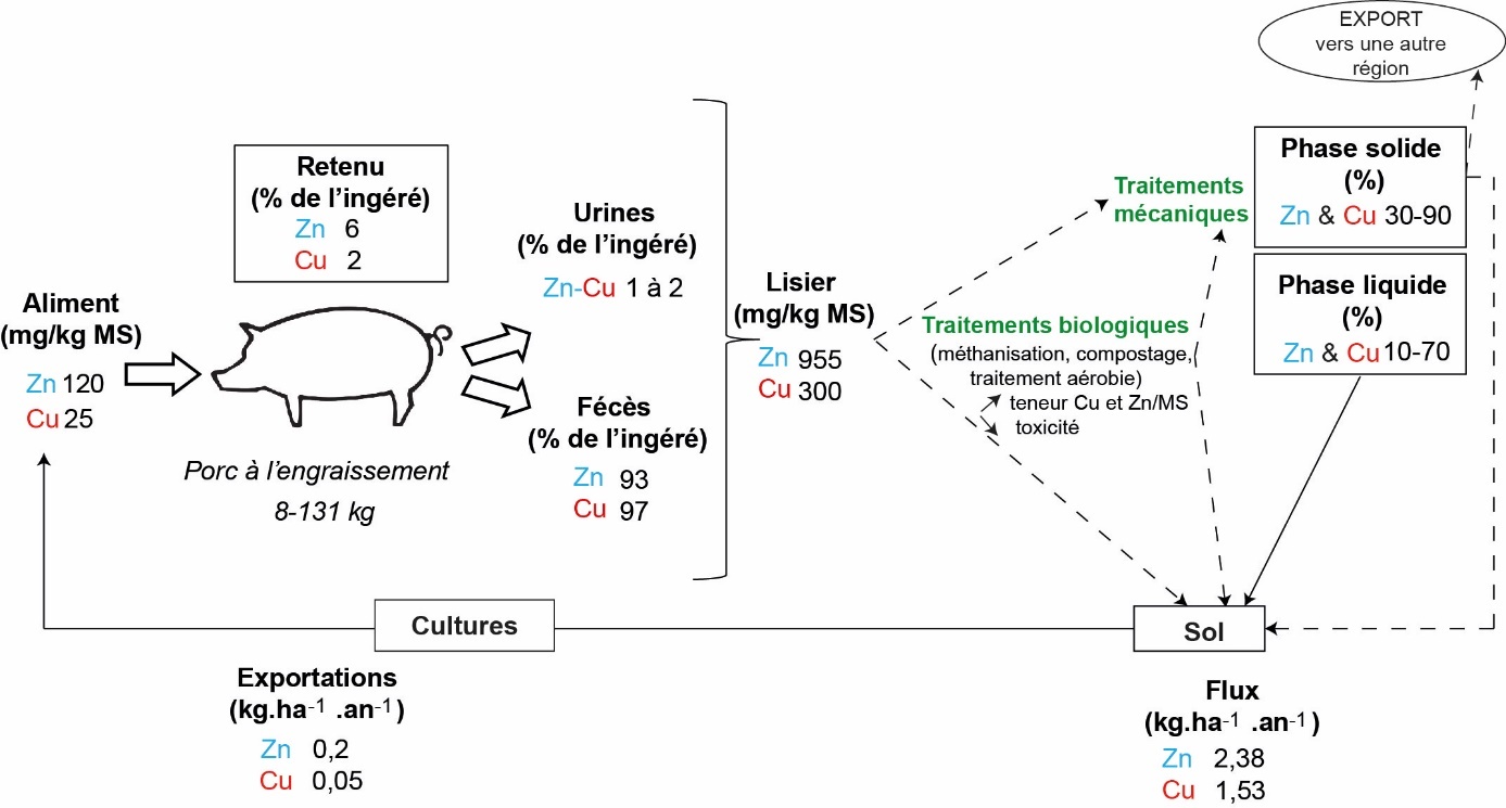 Pour limiter ces différents risques, aussi bien pour l'environnement que la santé animale et humaine, la réglementation européenne encadre de plus en plus strictement les quantités de Zn et de Cu pouvant être apportées dans l'alimentation animale (EU-2016/1095 ; EU-2018/1039), la nutrition constituant le principal levier pour en réduire les flux. Il existe aussi des réglementations relatives aux épandages de ces minéraux, et des cahiers des charges ou des normes spécifiques sur la teneur en Zn et en Cu des fertilisants et amendements organiques. Par ailleurs les différentes technologies de traitement des effluents qui se développent (compostage, digestion aérobie et anaérobie…) peuvent entraîner un accroissement de la concentration en ces éléments, notamment par rapport à la Matière Sèche (MS) (Hsu et Lo, 2001 ; Legros et al., 2017). La connaissance et le pilotage de ces flux dans un contexte de diversification des filières de valorisation des effluents sont ainsi des questions d'importance.