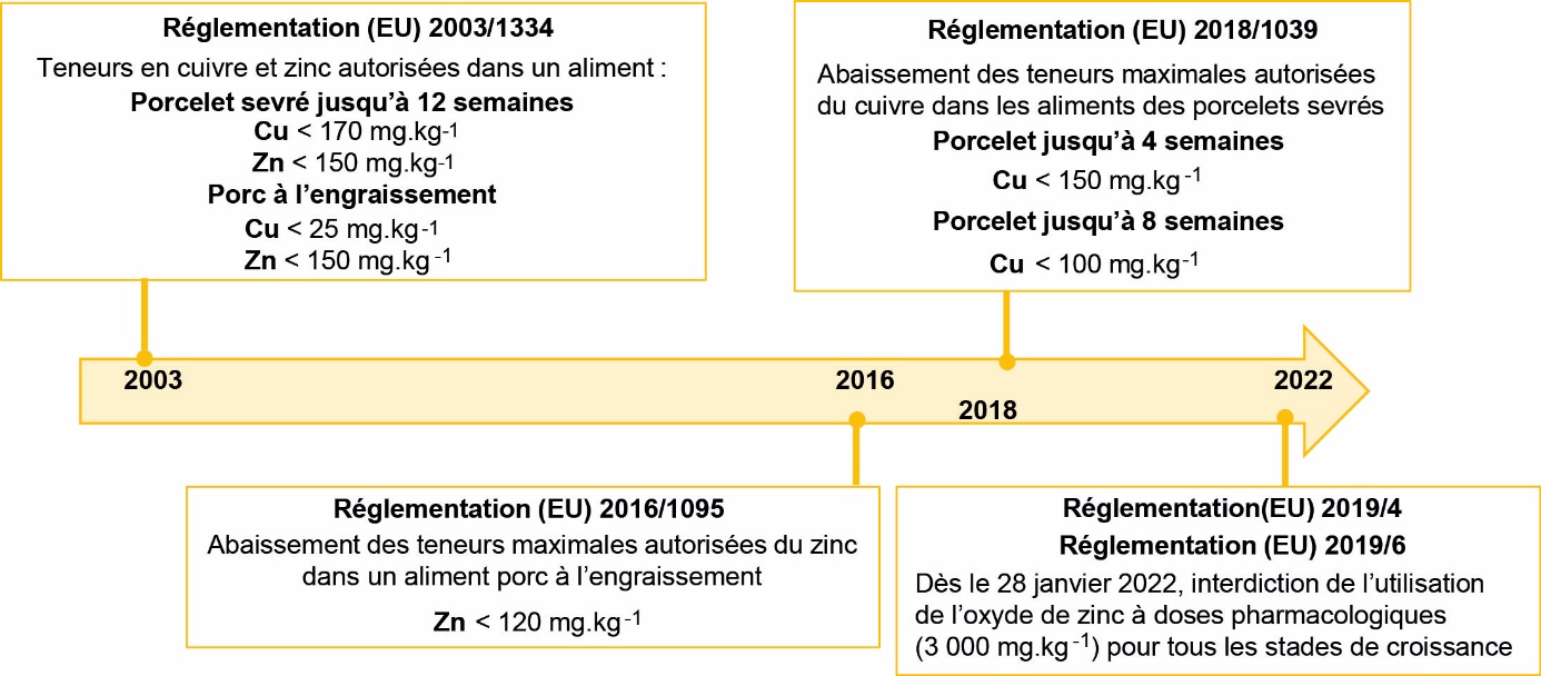 Les réglementations européennes concernant les teneurs maximales autorisées en Zn et en Cu dans l’alimentation du porc ont évolué depuis 2003 (figure 2).