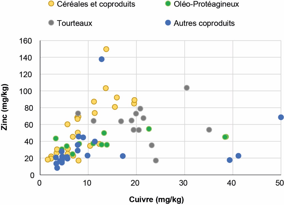 Les céréales, leurs co-produits, les oléo-protéagineux et tourteaux contiennent entre 5 et 15 mg de Cu par kg MS (figure 3).