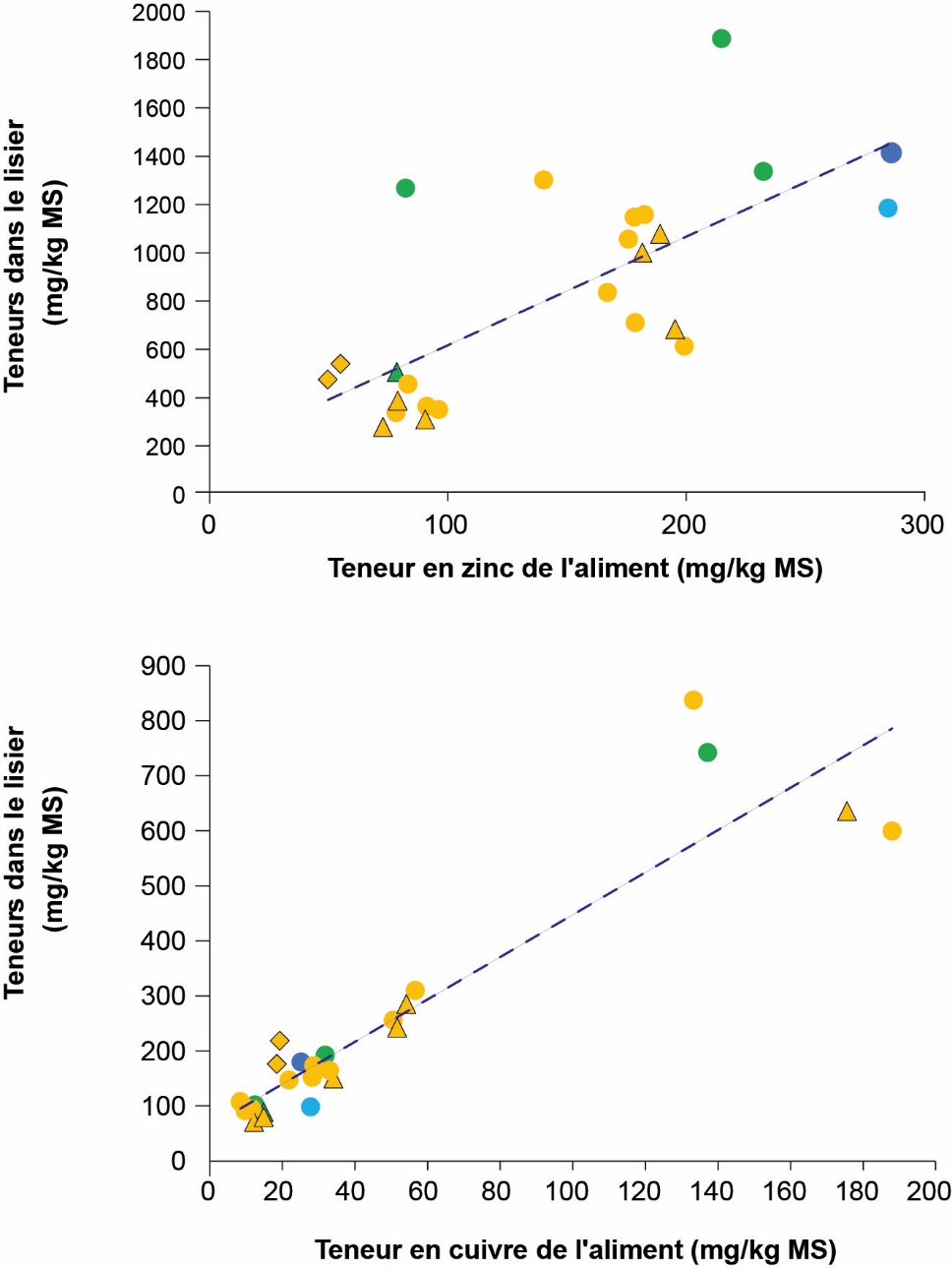 La composition des lisiers va principalement dépendre de la composition des aliments distribués aux porcs. La digestibilité de la MS et de la Matière Organique (MO) des aliments étant de l'ordre de 70-80 %, et donc plus élevées que celles du Zn et du Cu (de l'ordre de 1 à 2 %), ces ETM sont beaucoup plus concentrés dans les déjections que dans l'aliment. Les lisiers peuvent ainsi contenir jusqu'à 2 000 mg de Zn par kg MS et 1 000 mg de Cu par kg MS, en considérant tous types et stades d'animaux et d'alimentation (Dourmad et al., 2002 ; Jondreville et al., 2002 ; Marcato, 2007).