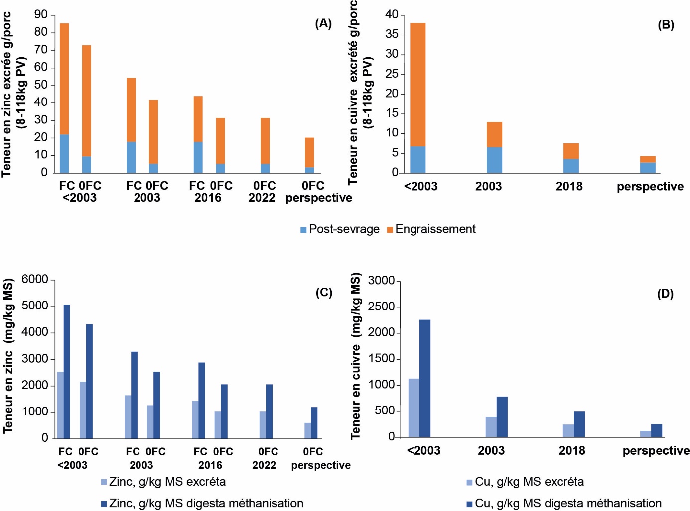Il existe différents leviers alimentaires pour réduire l'excrétion de Zn et Cu. Il est en effet possible de faire varier soit la forme de supplémentation, soit la quantité de Zn et Cu ajoutée dans l'aliment, soit les deux simultanément. En utilisant l'approche décrite par Dourmad et al. (2013), nous avons calculé l'excrétion de Zn et Cu des porcs entre le sevrage et l'abattage (de 8 à 118 kg PV) selon différentes hypothèses d'alimentation concernant les teneurs en Zn et Cu et prenant en compte l'évolution de la réglementation dans l'UE depuis 2003 et des perspectives pour le futur. Les résultats présentés à la figure 4A et 4B montrent clairement que l'évolution de la réglementation a conduit à une forte réduction de l'excrétion aussi bien pour Zn que pour Cu.