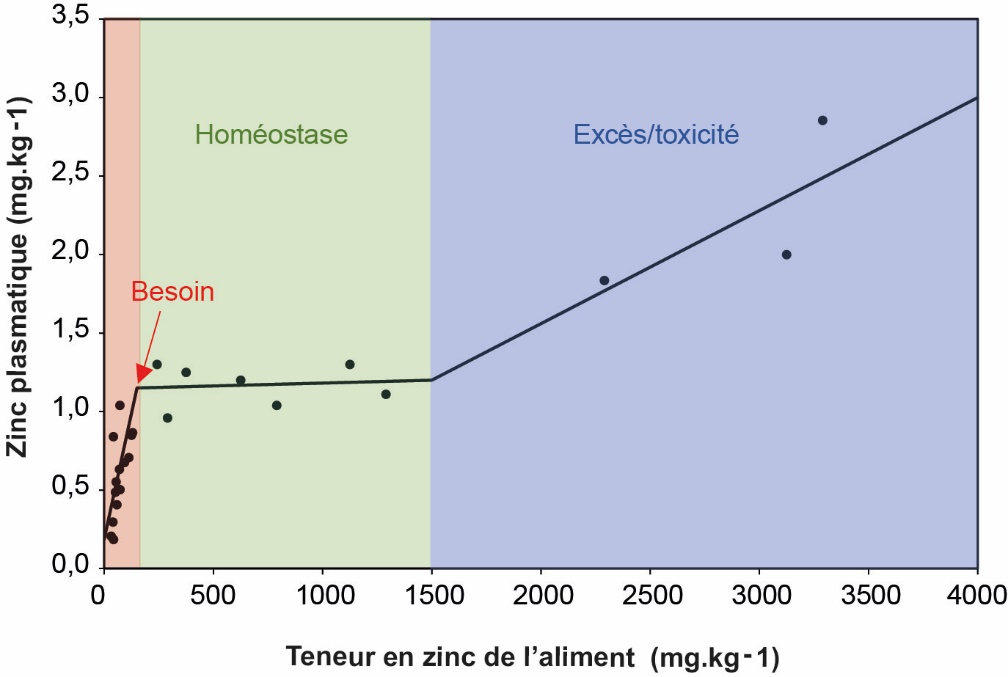Ceci est illustré sur la figure 1 pour le Zn chez le porcelet en post-sevrage, sur la base de différentes références bibliographiques. En fonction du niveau d’apport on peut ainsi définir i) une zone de carence (en rouge) dans laquelle l’apport n’est pas suffisant pour maintenir un niveau plasmatique adéquat ; ii) une zone d’homéostasie (en vert) dans laquelle le niveau plasmatique reste constant grâce à la mise en place de différents mécanismes d’homéostase (stockage, excrétion…) et iii) une zone d’excès (en bleu) dans laquelle la concentration plasmatique s’accroit avec l’apport alimentaire, les mécanismes d’homéostase étant vraisemblablement saturés. Le point de rupture entre la zone en rouge et en vert permet de définir le besoin nutritionnel, alors que la rupture entre la zone en vert et en bleu indique l’apparition d’un risque d’excès associé à une baisse de l’ingestion.