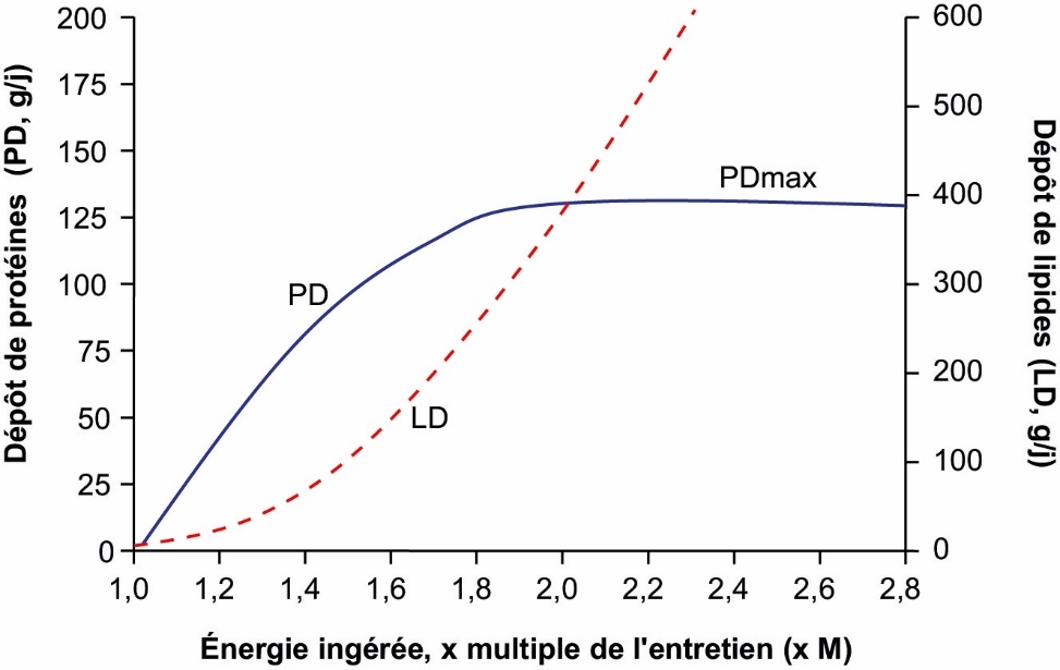 La quantité de protéines déposées augmente presque linéairement avec l'apport énergétique jusqu'à une valeur maximale (PDmax, figure 1) qui dépend de la quantité d'Acides Aminés (AA) essentiels disponibles ou du potentiel de croissance de l'animal (Bikker et al., 1995 ; van Milgen et al., 2000). Une fois le PDmax atteint, l'énergie supplémentaire ingérée est déposée sous forme de lipides, ce qui conduit à une diminution du rapport protéines/lipides dans le gain de poids marginal. La quantité d'énergie qui permet d'atteindre le PDmax est considérée comme l'apport énergétique optimal au regard du Gain de poids Moyen Quotidien (GMQ) et de l'Indice de Consommation (IC) associé. Au-delà, le GMQ augmente peu, tandis que l'IC se détériore fortement.