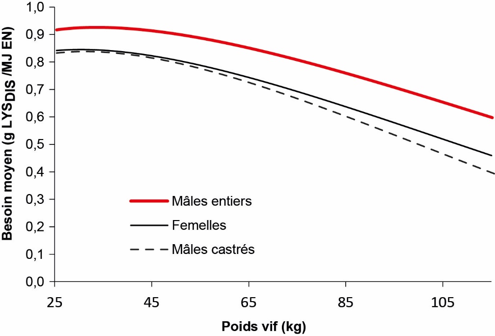 Le besoin en AA essentiels par unité d'énergie est plus important chez les ME que chez les MCC et chez les femelles. Cela résulte d'une combinaison entre un gain pondéral plus maigre et un appétit moindre (Quiniou et al., 2010). L'écart de besoins est plus ou moins marqué entre les différents types sexuels présents dans la bande et selon le niveau de performance observé. Quiniou et al. (2010) ont modélisé l'évolution du besoin en lysine digestible iléale standardisée (LYSDIS) selon le sexe et considèrent que celui des ME est en moyenne plus élevé de 0,1 g/MJ EN comparativement à celui des MCC (figure 2). Cela conduit à recommander pour les ME une formulation à 0,94 g LYSDIS/MJ EN en période de croissance (soit + 16 %) et à 0,81 g LysDIS/MJ EN en période de finition (soit + 14 %). Aymerich et al. (2020) concluent à une augmentation proche du besoin, + 17 % pour les ME par rapport aux femelles (0,91 vs. 0,75 g LYSDIS/MJ EN).