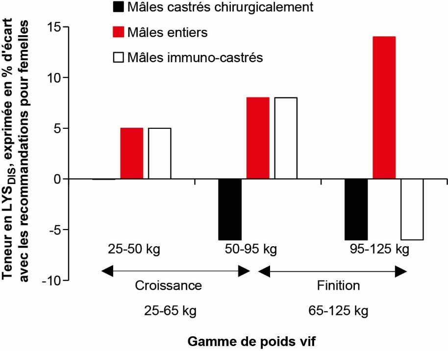 Figure 3. Écarts de teneur recommandée1 en lysine digestible iléale standardisée (LYSDIS) dans les aliments distribués aux porcs mâles entiers, castrés chirurgicalement ou immuno-castrés dans une séquence alimentaire en trois phases (d'après Dunshea et al., 2013)