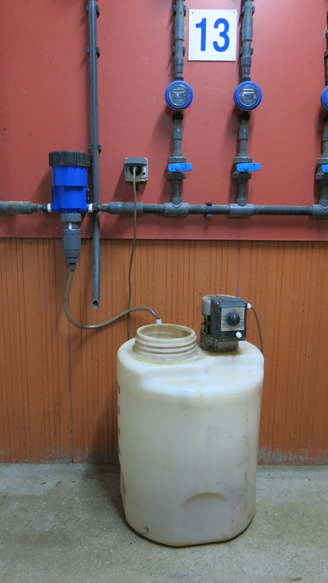 Figure 3. Installation de pompe doseuse permettant la distribution d’antibiotiques dans l’eau de boisson (photo Anne Hemonic). Plus souple et réactive que l’administration dans l’aliment, l’administration d’antibiotiques dans l’eau de boisson grâce à la pompe doseuse a permis de réduire l’usage d’antibiotiques dans les filières monogastriques.