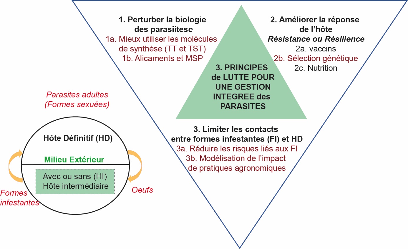 L’objectif de cette revue est de présenter divers aspects du concept de lutte intégrée à partir de travaux récents de plusieurs équipes INRAE dont les thématiques de recherche portent sur les Interactions Hôte-Parasites. La diversité des modèles parasitaires retenus (helminthes ou insectes, petits ruminants ou bovins ; conditions tempérées ou tropicales) vise à illustrer les divers principes et options à la base de l’idée de lutte intégrée en soulignant l’aspect générique d’applications du modèle ainsi que la nécessité de l’adapter en fonction de la biologie des parasites impliqués et des facteurs gouvernant l’épidémiologie des infections/infestations.