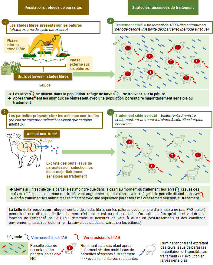Le Traitement Ciblé (TC) contre les NGI consiste à traiter 100 % des animaux d'un groupe lorsqu'il subit une période à risque en cours de saison de pâturage. La population refuge est dans ce cas assurée par les stades libres présents alors en grand nombre sur les pâtures (figure 3, cas 1). Mais cette population refuge ne peut assurer son rôle de dilution des parasites résistants que si les conditions environnementales permettent une bonne survie des stades larvaires et que si les animaux restent sur cette/ces même(s) pâture(s) jusqu'à se réinfester (Greer et al., 2020).