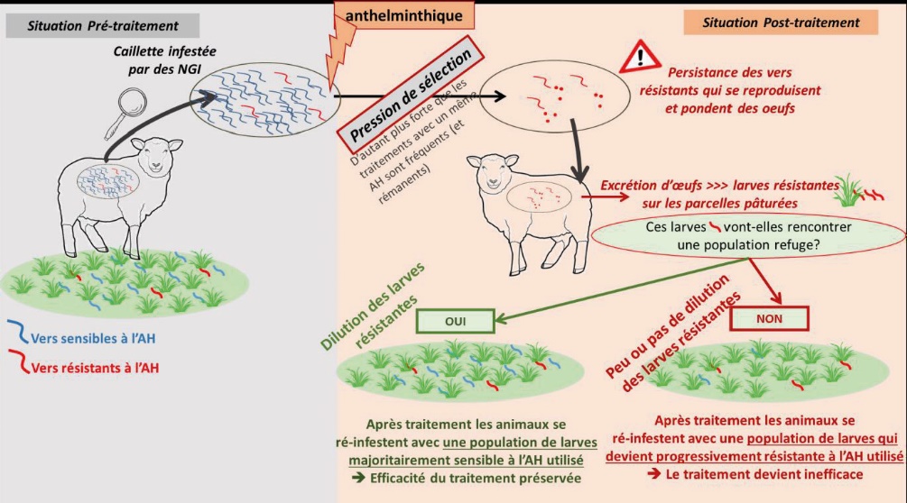 Chez les ruminants au pâturage, les anthelminthiques (AH) ont été et sont encore administrés sans évaluation préalable du niveau de risque parasitaire (Kenyon et Jackson, 2012). Les protocoles n'ont pas varié. Ils utilisent des molécules appartenant à la même famille d'AH et facilitant la manipulation des animaux (administration sur la ligne du dos/formulation pour-on) : traitements de l'ensemble des animaux d'un même lot, à la mise à l'herbe, lors d'un changement de parcelle en été, ou à la rentrée en bâtiment en automne-hiver (Ravinet et al., 2017). Ces pratiques usuelles de traitement exercent une forte pression de sélection sur les populations de NGI car elles ne permettent pas la préservation de populations refuges, ce qui conduit à l'émergence de résistances vis-à-vis des AH et donc à l'inefficacité partielle ou complète des AH dont on dispose.