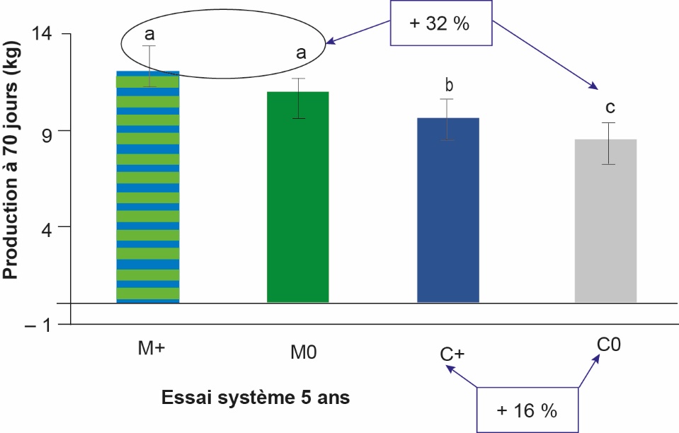 Par ailleurs, l'éleveur peut également composer la diversité génétique au sein de son troupeau en agençant différents potentiels de résistance d'animaux intra race, ou entre races, voire entre espèces (Mandonnet et al., 2020). Combinant les complémentarités de comportements et de production, il expose ainsi ses animaux les plus sensibles à une pression parasitaire supportable, même quand les conditions climatiques sont favorables aux parasites. Cette approche fait l'objet de travaux de modélisation pour définir, dans des conditions agropédoclimatiques données, le mélange optimal de génotypes permettant de garantir la survie et la productivité de troupeaux ovins au pâturage soumis au parasitisme gastrointestinal (Laurenson et al., 2012 ; Saccareau et al., 2016). De tels mélanges garantissent la stabilité des performances du troupeau et leur optimisation dans des situations d'infestivité variables des pâturages avec un nombre limité de traitements. Une démonstration expérimentale a pu en être donnée dans le cas particulier du pâturage mixte de chèvres Créole en production avec des génisses Créole dans un rapport de chargement entre chèvres et génisses égal à 1 en poids métabolique (Blaes et al., 2010). La productivité des chèvres allaitantes (exprimée en kg de poids vif produit à 70 jours de lactation) était augmentée de 16 % par la sélection pour une excrétion réduite à 11 mois d'âge, et de 32 % en combinant sélection et pâturage mixte (figure 4). Dans les systèmes à diversité renforcée, l'espacement des traitements peut être envisagé avec un maintien des performances au niveau des chèvres conduites seules.