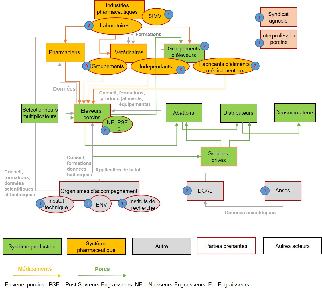L'État, exerce un contrôle sanitaire, élabore des règlements et peut utiliser des incitations financières favorisant l'implantation de bonnes pratiques. L'Anses – Agence Nationale du Médicament Vétérinaire (ANMV) apporte une expertise sur l'usage des antimicrobiens, fournit des recommandations concernant les pratiques et la réglementation pour l'autorisation, ou l'interdiction de produits. Les instituts de recherche et technique (INRAE, Ifip, chambres d'agriculture) apportent des données scientifiques sur l'usage des antibiotiques, fournissent des conseils et supervisent les pratiques. Ils organisent également des formations destinées aux vétérinaires, éleveurs et autres parties prenantes.