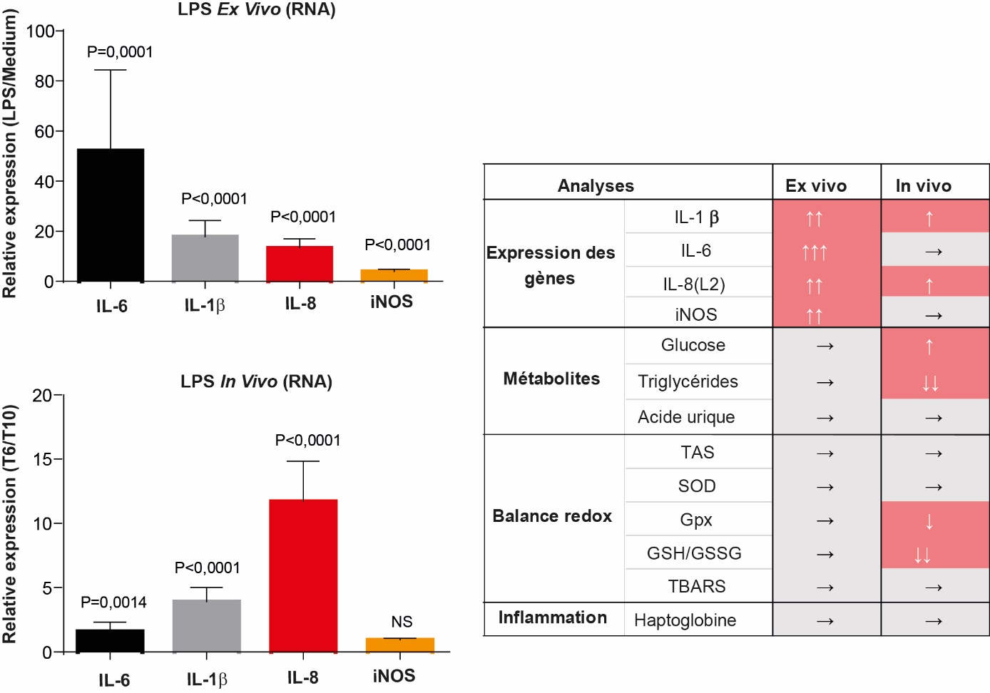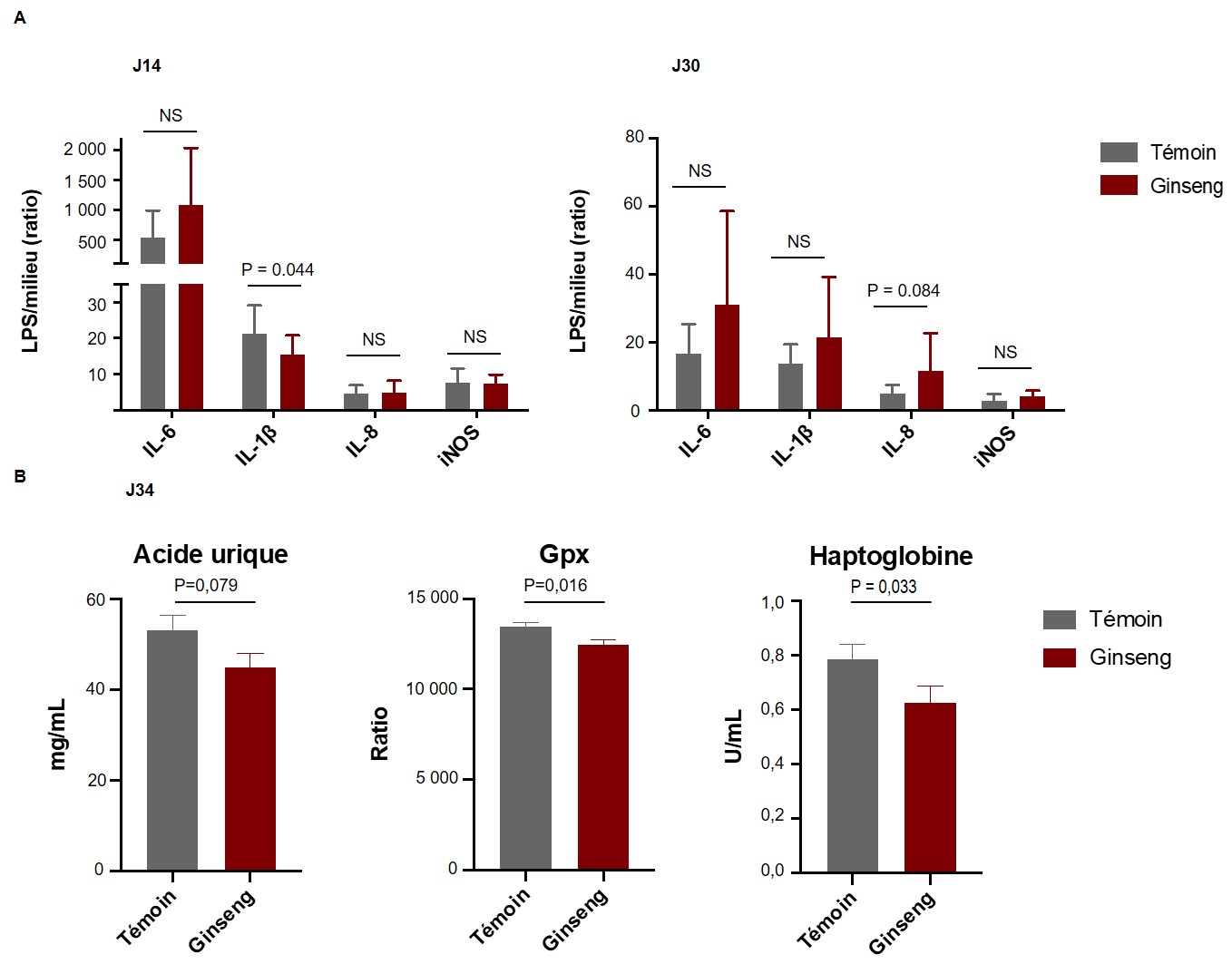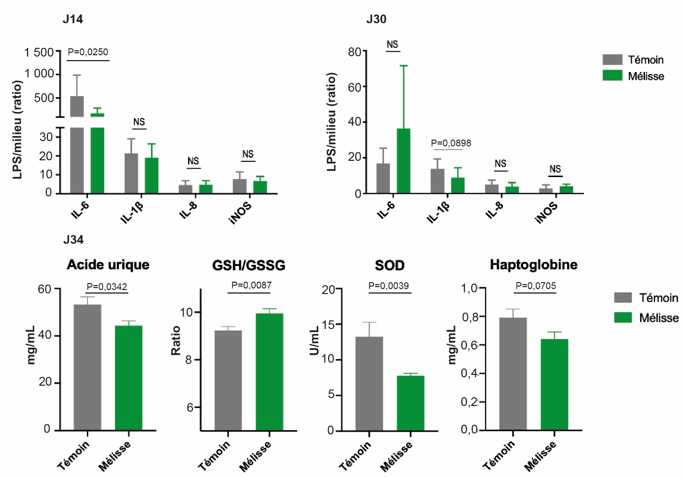 Un potentiel effet immunomodulateur a été observé pour l’extrait de mélisse (100 µg/mL), notamment après 6 h d’incubation, où l'activation du facteur de transcription NFκB est 19 fois plus élevée par rapport au témoin négatif (milieu seul) (figure 4C). Le lipopolysaccharide (LPS) d’origine bactérienne, communément utilisé pour induire une inflammation expérimentale in vivo ou in vitro sur cellules (témoin positif, à 1 µg/mL) a induit une augmentation de 25 fois de l’activation de NFκB par rapport au témoin négatif. Les effets de l’extrait de ginseng sont discrets par rapport à l’extrait de mélisse et n’excèdent jamais 5 fois plus par rapport au témoin négatif. Ces données suggèrent que l’extrait de mélisse mobiliserait de façon très efficace le facteur de transcription NFκB lors de la réponse des macrophages chez le poulet.