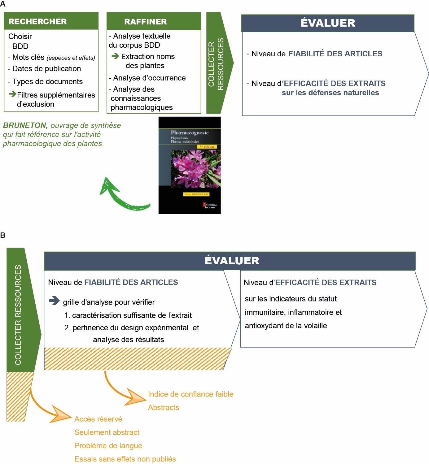 Des chercheurs et praticiens en phytochimie et zootechnie ont conçu et mis en application une méthodologie d'aide à la sélection d'extraits de plantes potentiellement intéressants, a priori, pour renforcer l’immunité des volailles. Le groupe de travail s’est inspiré de la méthodologie utilisée dans la Saisine 2013-SA-0122 relative à l'état des lieux des alternatives aux antibiotiques en vue de diminuer leur usage en élevage (Anses, 2018). Une première étape consiste à sélectionner les plantes mentionnées dans la bibliographie comme ayant la capacité de moduler l’immunité des volailles. Une seconde étape consiste à utiliser pour chaque publication des grilles d’analyse construites pour permettre 2 niveaux d’évaluation : la fiabilité de la source bibliographique et les effets biologiques de l’extrait de plante étudié au regard des objectifs visés (stimulation de l’immunité) (figure 1A).