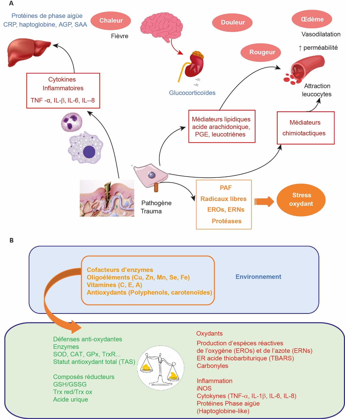 Figure 3. Réponse inflammatoire, ses différents acteurs et médiateurs (A) et les différents acteurs et régulateurs de la balance d’oxydo-réduction (B).