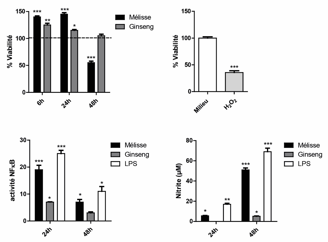 En résumé, l’extrait de ginseng présente une innocuité plus stable aux différentes concentrations testées sur la lignée de macrophages aviaires en comparaison à l’extrait de mélisse. Il induit peu ou pas d’effet immunostimulant sur les macrophages H11 alors que l’extrait de mélisse révèle une activité immunostimulante à prendre en considération. Cette méthodologie simple et rentable peut donc être réalisée en première intention pour évaluer l’innocuité et la bio-activité d'extraits de plantes dans des cellules eucaryotes de l’espèce animale d’intérêt avant d’envisager des tests in vivo, conformément au REACH et au principe des 3Rs (Richmond, 2000). Toutes les méthodes utilisées ici sont accessibles et peuvent être facilement mises en œuvre dans des laboratoires vétérinaires ayant une expertise en biologie cellulaire et en biochimie.