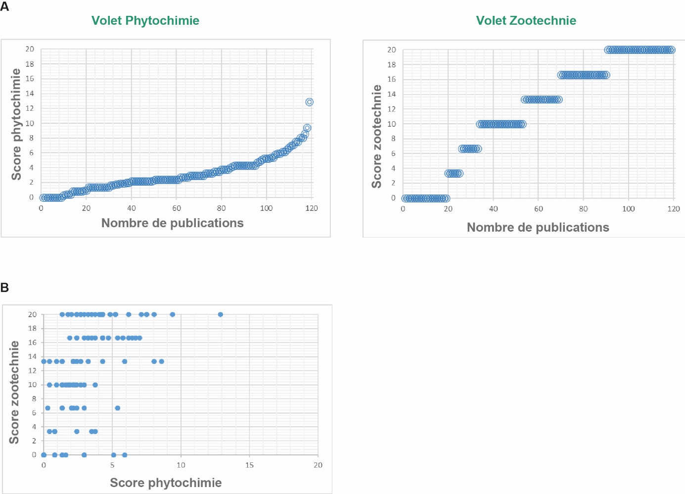 Figure 2. Répartition des scores sur le volet « Phytochimie » et sur le volet « Zootechnie » des articles étudiés (A), représentation pour chaque article, du score « Phytochimie » en fonction du score « Zootechnie » (B).