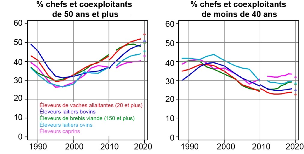 Les exploitations avec élevage de ruminants de taille significative regroupent au recensement agricole 2020 la moitié des emplois agricoles non-salariés (en équivalents temps plein) de la France métropolitaine. Les chefs d’exploitation et coexploitants connaissent un vieillissement marqué en particulier dans les secteurs bovins lait et viande, mais moins prononcé que pour les exploitations sans élevage. C’est cette évolution qui déclenche des interrogations sur les conséquences, notamment en termes de volume de production, de la vague de départs inéluctable qui lui est associée. Néanmoins, le pourcentage d’éleveurs de moins de 40 ans semble s’être stabilisé depuis 2010, à des niveaux variables selon les secteurs, grâce au maintien d’un flux conséquent d’entrées de jeunes et moins jeunes actifs aux profils et aux choix productifs très variés. Ces installations développent la diversité des exploitations avec élevage de ruminants, aussi bien pour les exploitations individuelles, plus fréquemment en double activité et/ou reprises hors cadre familial et orientées vers des circuits courts, que pour les GAEC, plus fréquemment familiaux, qui poursuivent leurs croissances individuelles en taille et volume de production. Malgré une réduction du volume de main-d’œuvre nettement plus rapide dans les exploitations avec élevage de ruminants (– 20 % en dix ans contre – 11 % pour l’ensemble de l’agriculture), l'analyse des trajectoires des actifs montre, sur la dernière décennie, une meilleure stabilité individuelle des travailleurs dans ces élevages, ceux-ci restant plus fréquemment dans le secteur entre 2010 et 2020, quel que soit leur statut, et révèle que les salariés peuvent, mieux qu’ailleurs, constituer des candidats à l’installation.