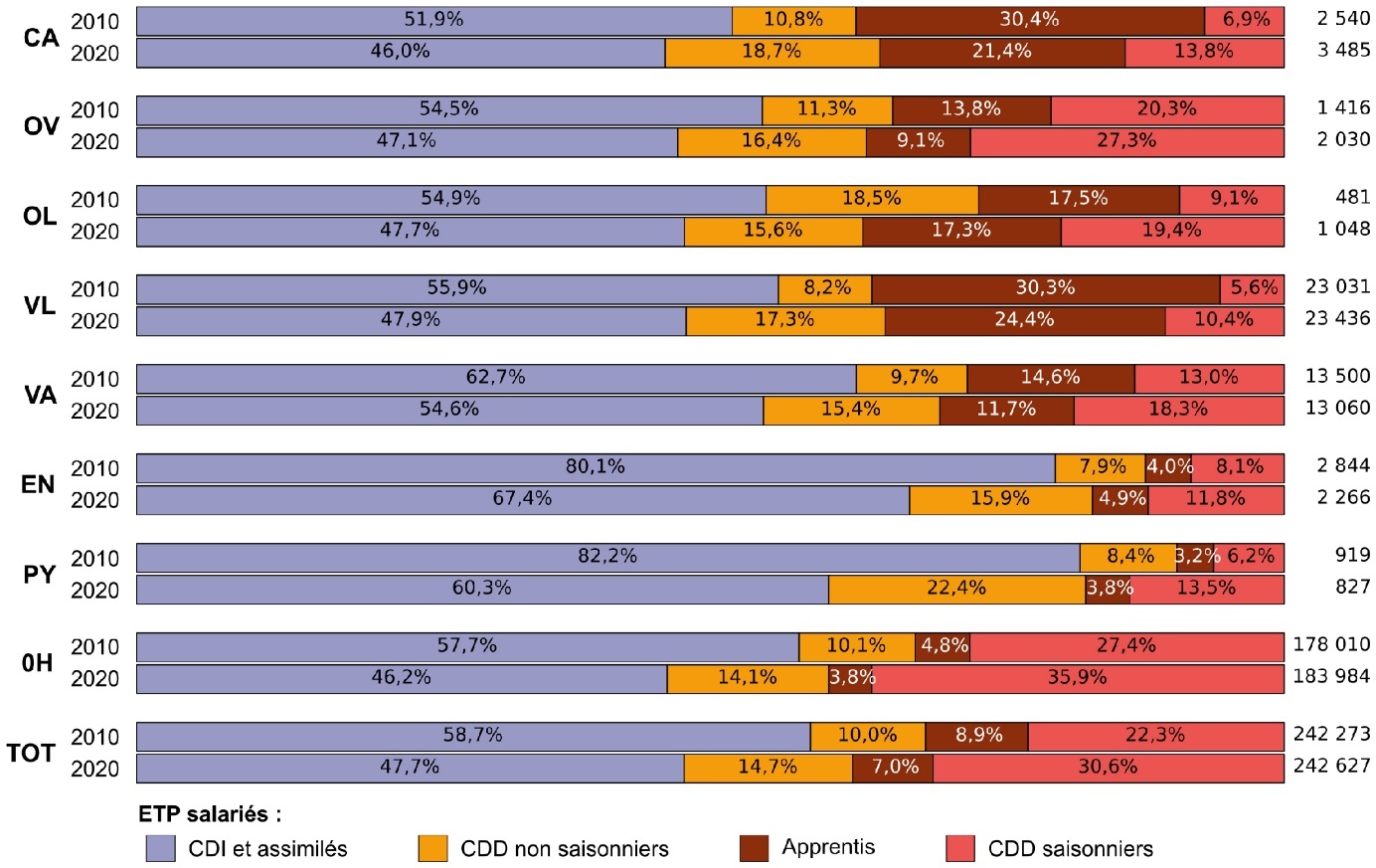 Comme évoqué, une fois cette typologie établie, un appariement original entre les RA 2010 et 2020 et les données « salariés » et « non-salariés » de la MSA permet de caractériser les exploitations où travaillent ces actifs. Le statut des salariés agricoles est caractérisé pour chaque contrat en reprenant la typologie développée dans le cadre du projet Actif’Agri (Depeyrot et al., 2019), entre Contrats à Durée Indéterminée (CDI), Contrats à Durée Déterminée (CDD) saisonniers et non saisonniers, et contrats d’apprentissage. Les ETP salariés sont calculés sur la base de 1 820 heures annuelles.