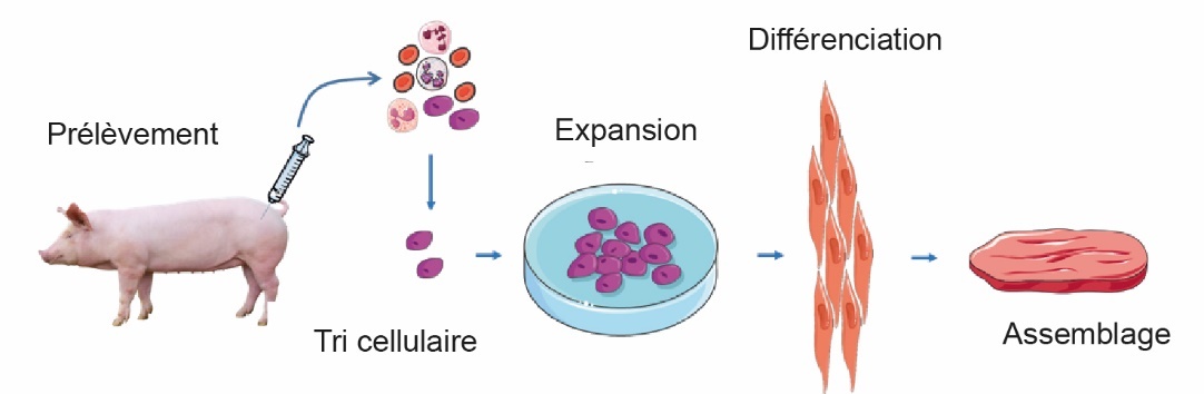 Figure 3. Principales étapes nécessaires à la production de viande « cultivée » à partir d'une biopsie animale.