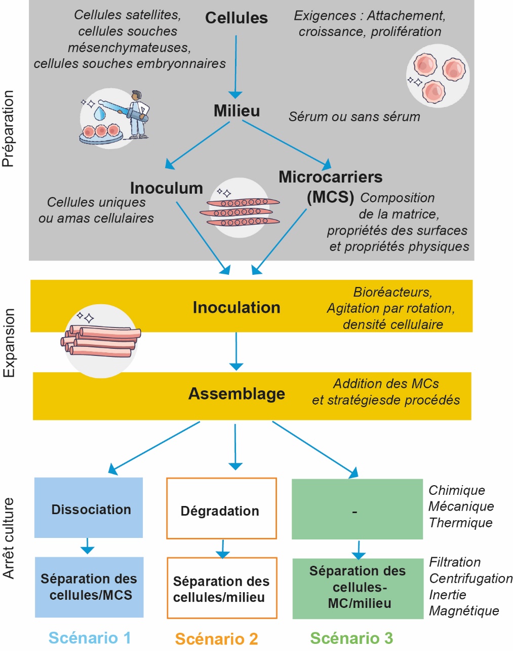 Figure 4. Processus et scénarios pour les bioprocédés à base de microcarriers (MC).