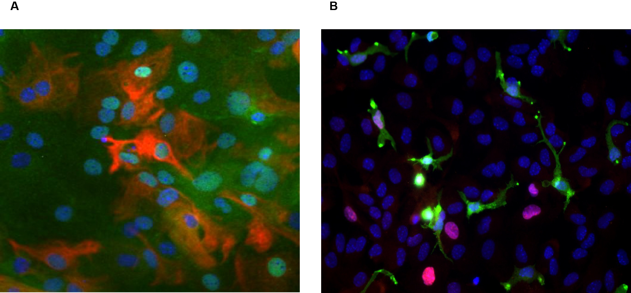 A : Photographie d’une immunocytologie en fluorescence d’une culture de NSC avant différenciation. Les NSC sont constituées de trois populations : en orange, cellules GFAP (Glial fibrillary acidic protein)+/Nestin+ (cellules souches proprement dites, B1) ; En vert, cellules Nestin+ (progéniteurs intermédiaires C), en rouge, cellules GFAP+ (Astrocytes) ; en Bleu le DAPI (noyaux cellulaires)