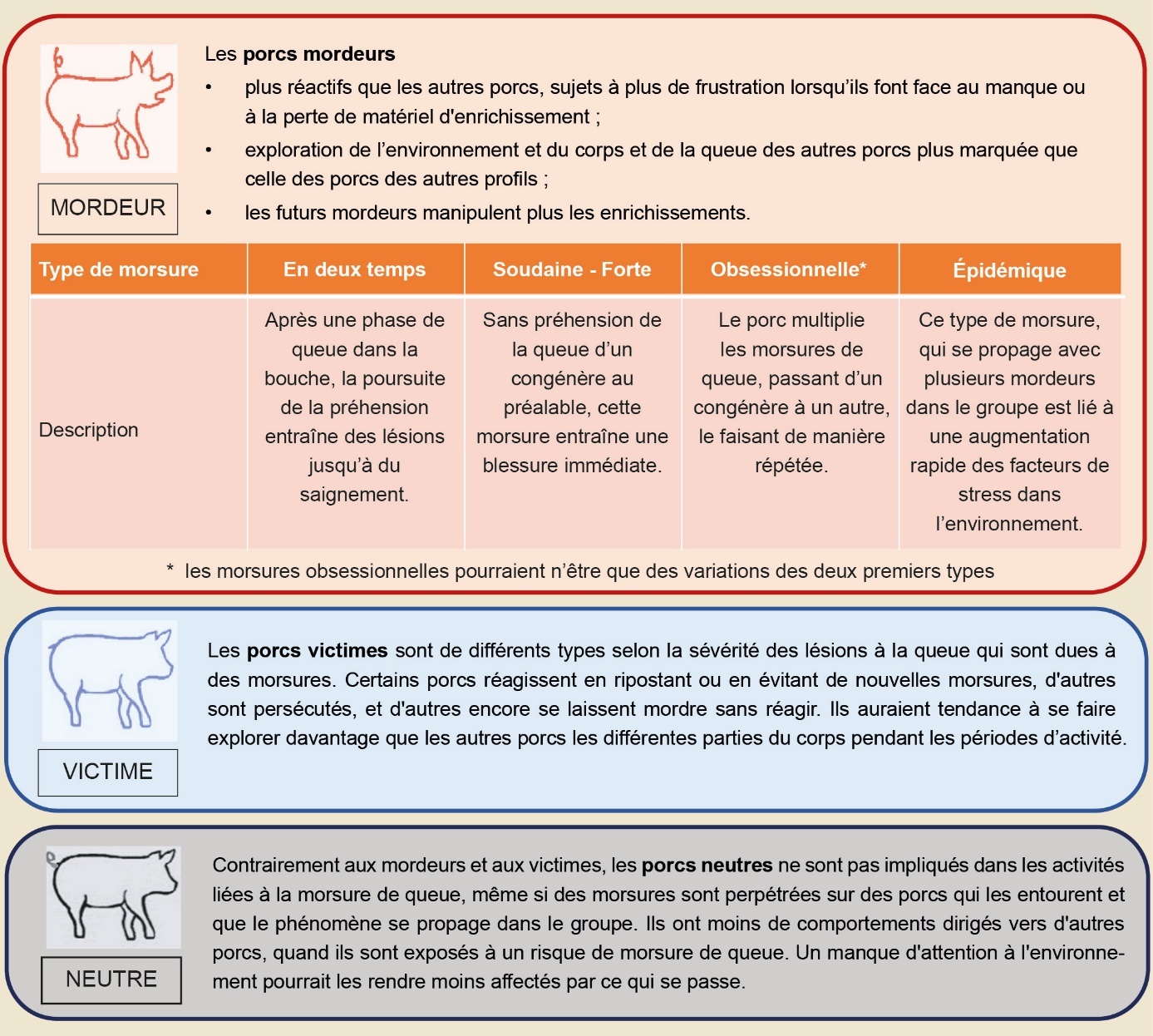Encadré 1. Classification des trois profils de porcs, mordeur, victime ou neutre, définis selon les comportements associés à la morsure de queue, d’après Taylor et al. (2010) et Valros (2018).