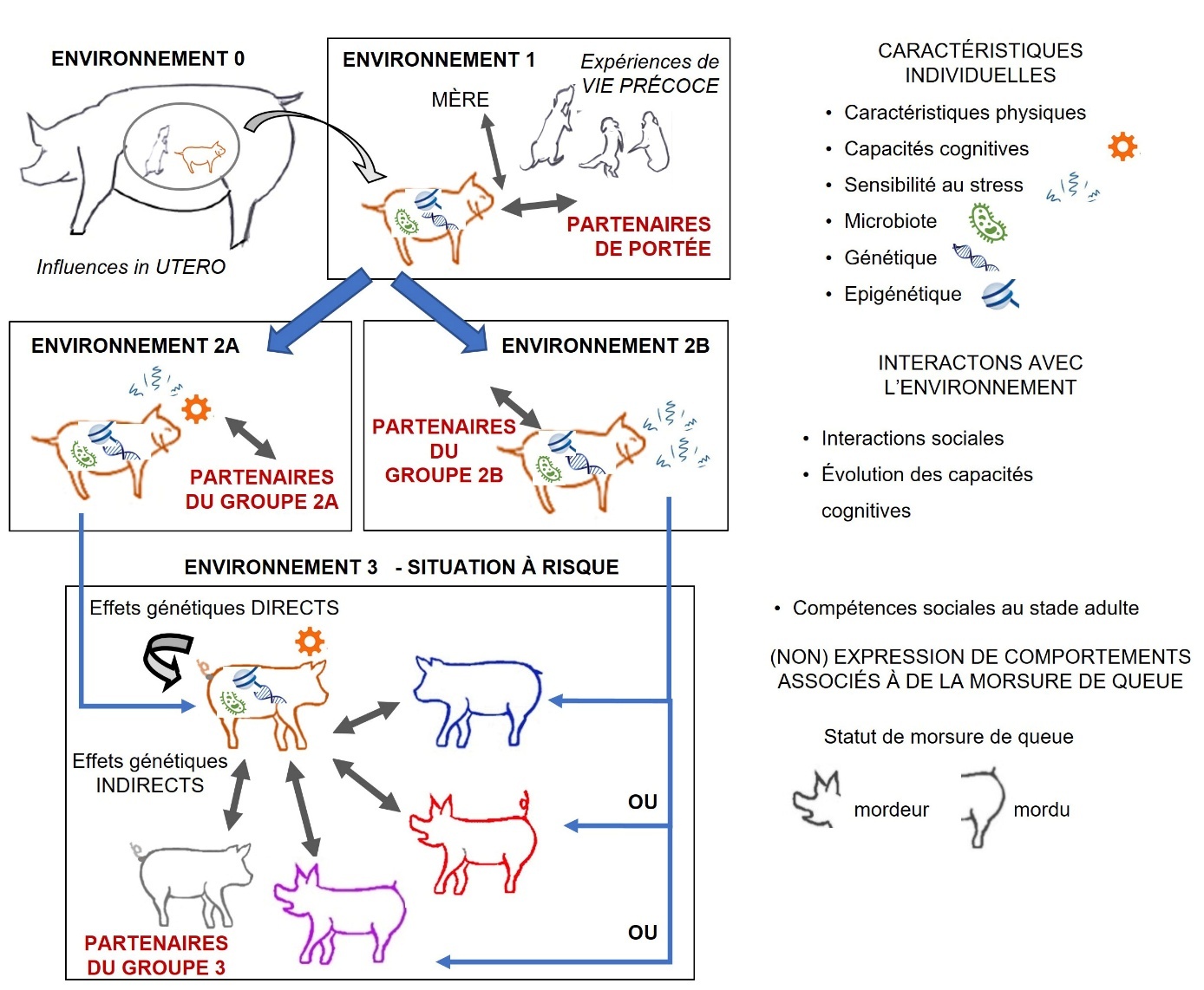 Figure 2. Représentation des effets intrinsèques, environnementaux et des effets génétiques indirects d’un porc sur le comportement des autres porcs qu’il côtoie au stade adulte, en lien avec la morsure de queue.