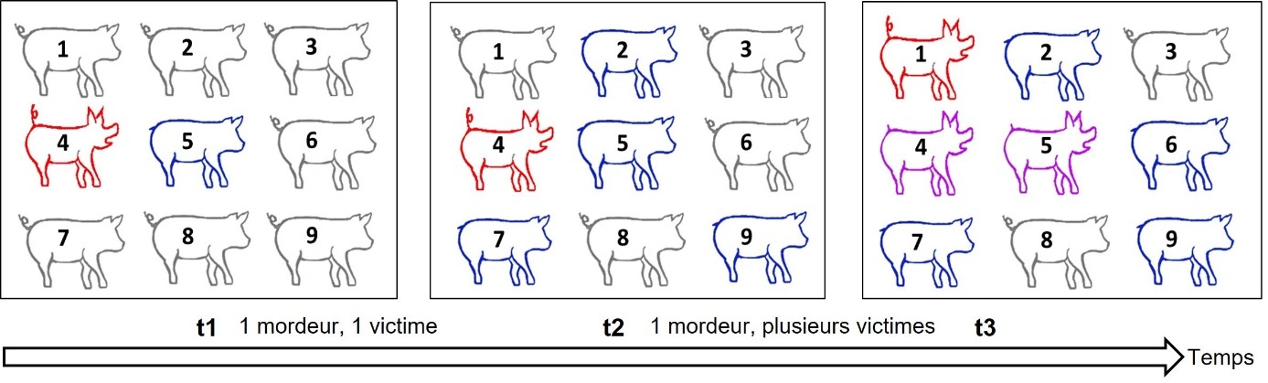 Avec : en rouge les mordeurs, en bleu les victimes, en violet les individus à la fois mordeurs et victimes et en gris, les porcs qui ne sont ni mordeurs ni victimes.