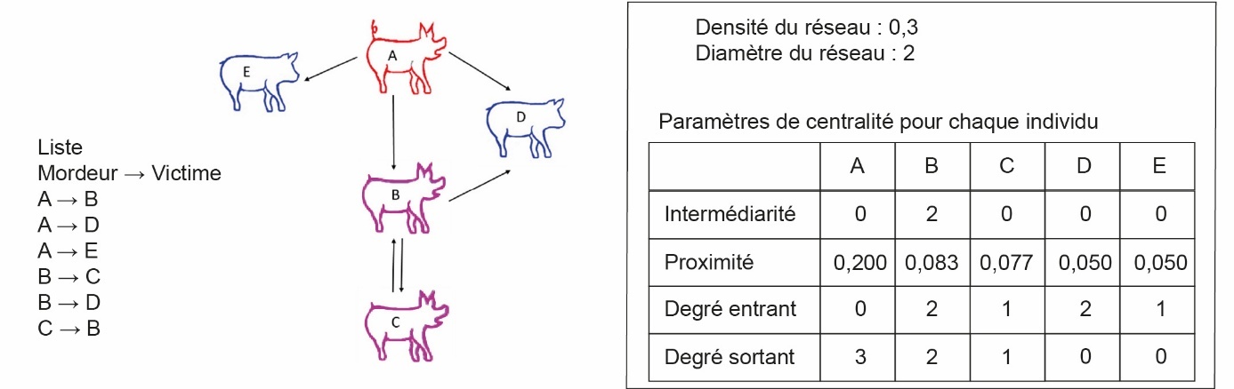 Le porc A est mordeur des porcs B, D, E ; C et D sont victimes de B, et B est aussi victime de C. Les valeurs des paramètres de centralité sont calculées pour chaque individu en fonction de sa position dans le réseau et des interactions qui existent avec ses congénères. Plus la proximité est élevée, plus l’individu est considéré comme influent et plus l’intermédiarité est élevée, plus l’individu est considéré comme propagateur (ici, de comportements).