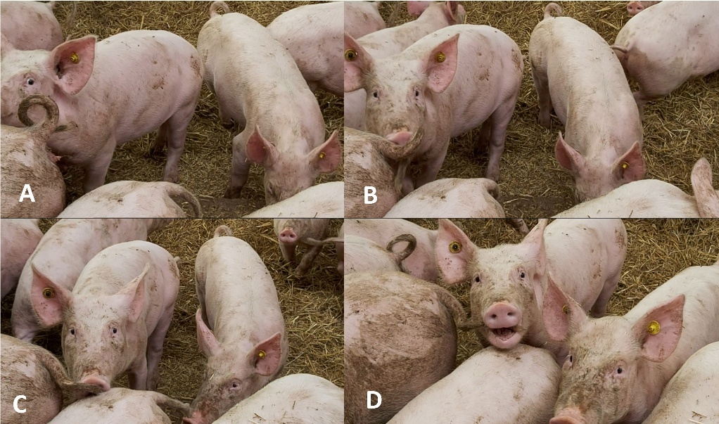 Figure 1. Illustration d’une séquence de préhension de la queue d’un congénère observée en élevage biologique INRAE (photos : © L. Canario).