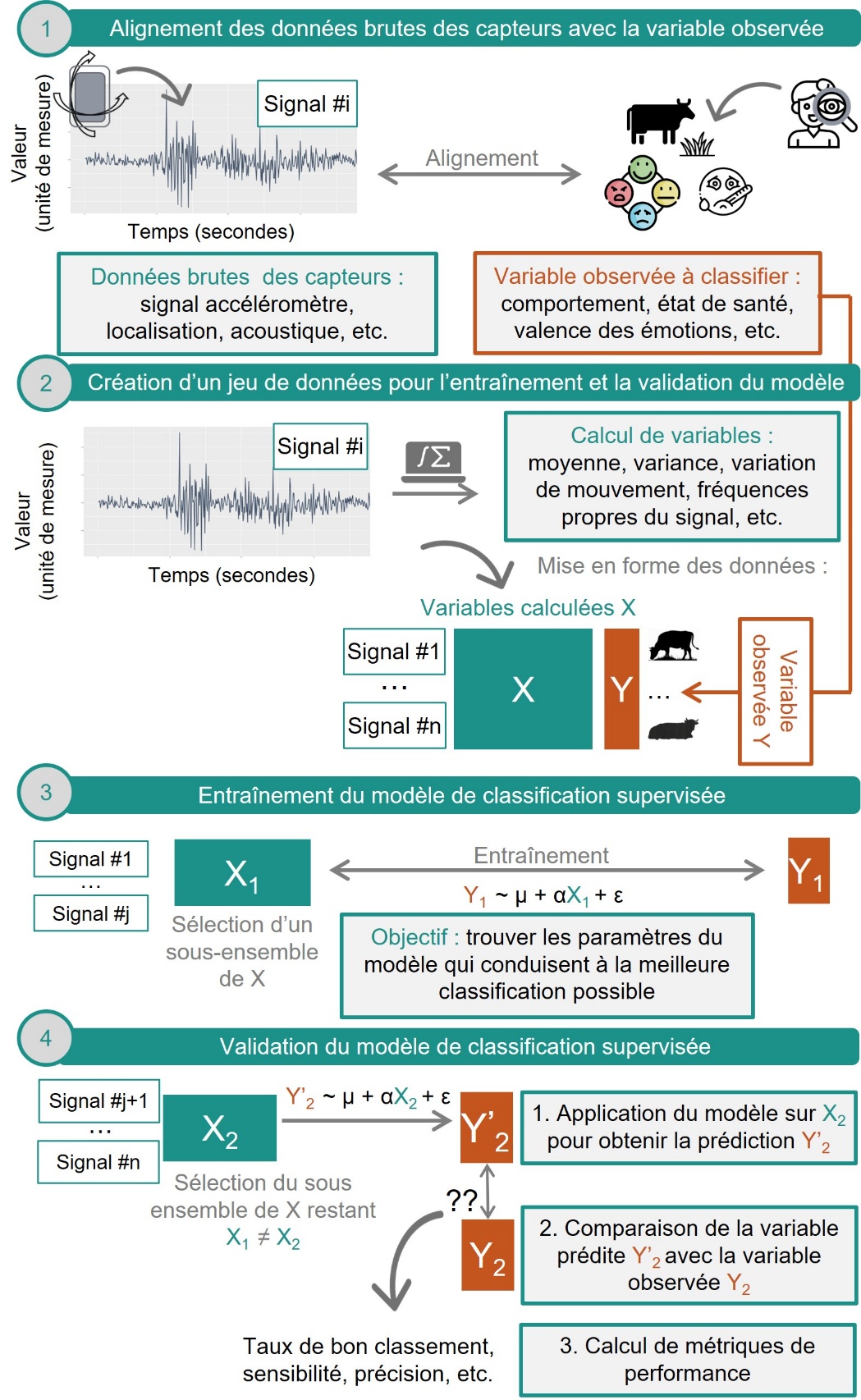 Le développement du modèle de classification (souvent les forêts aléatoires) s’articule selon une méthodologie classique en trois étapes (figure 2). Elle implique i) la collecte de données issues des accéléromètres et l’annotation des comportements réalisés par les animaux équipés avec ces accéléromètres (variable observée), ii) le prétraitement des signaux accéléromètres, impliquant le filtrage des données, leur alignement avec les comportements annotés et le calcul de variables statistiques caractéristiques du signal (p. ex. moyenne, médiane, écart-type, variation de mouvement, entropie spectrale…) et iii) l’entraînement et la validation d’un algorithme d’apprentissage supervisé à partir des variables accéléromètriques et des comportements annotés (Riaboff et al., 2022).